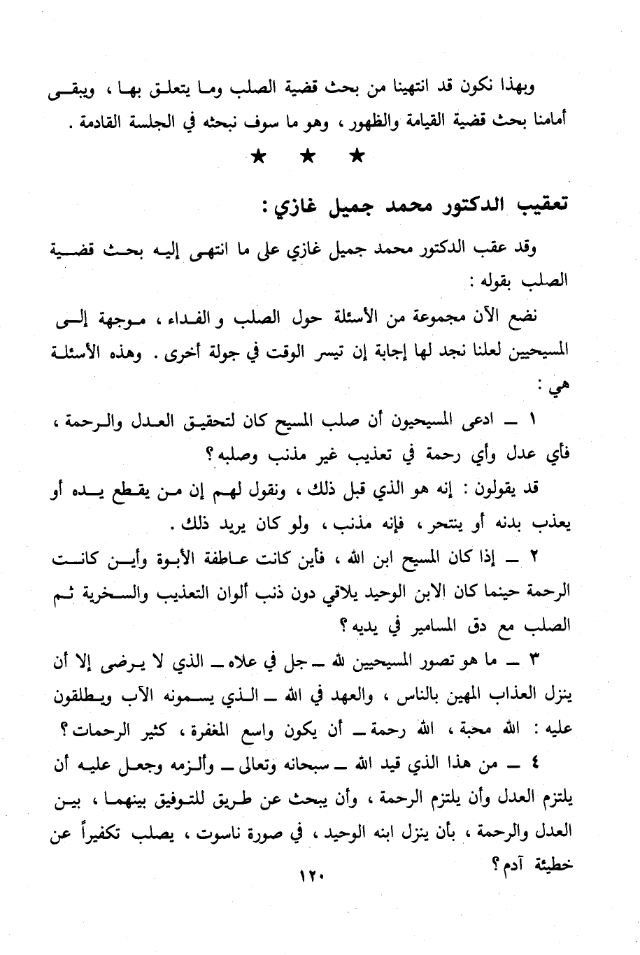 4 - من هذا الذي قيد الله - سبحانه وتعالى - وألزمه وجعل عليه أن يلتزم العدل وأن يلتزم الرحمة، وأن يبحث عن طريق للتوفيق بينهما، بين العدل والرحمة، بأن ينزل ابنه الوحيد، في صورة ناسوت، يصلب تكفيرا عن خطيئة آدم؟