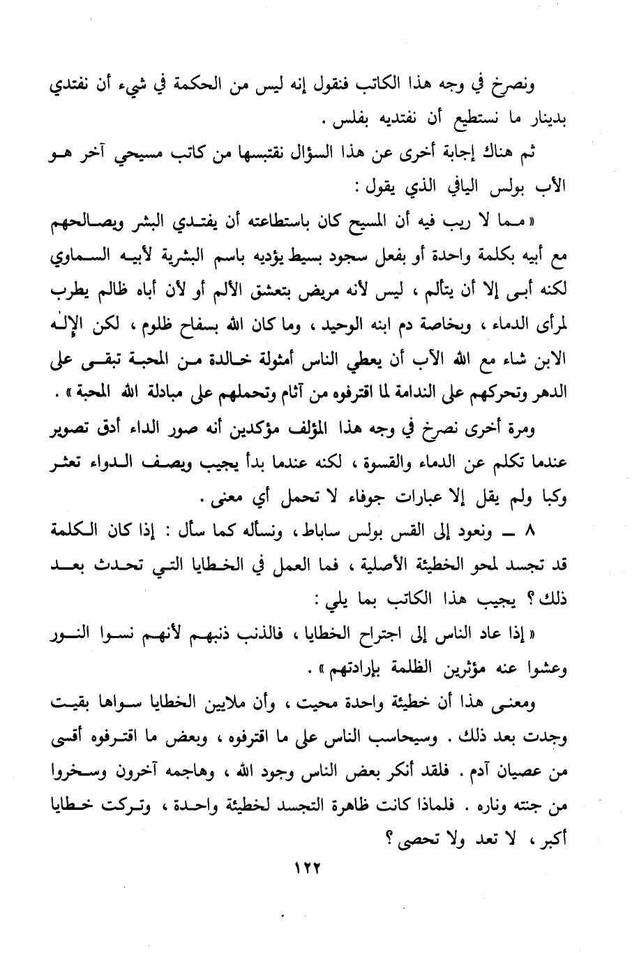 8 - ونعود إلى القس بولس ساباط، ونسأله كما سأل: إذا كان الكلمة قد تجسد لمحو الخطيئة الأصلية، فما العمل في الخطايا التي تحدث بعد ذلك؟ يجيب هذا الكاتب بما يلي: