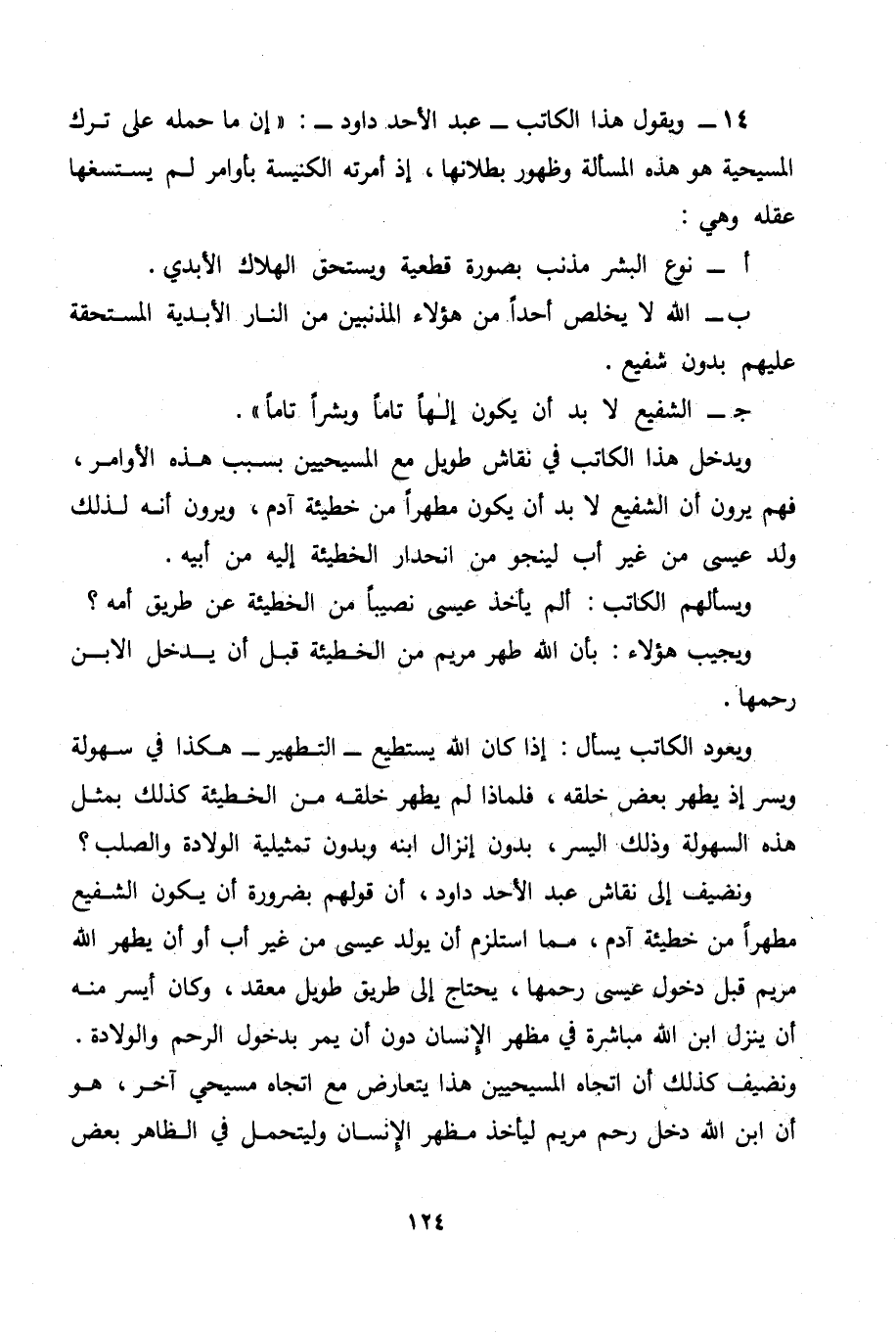 ويعود الكاتب يسأل: إذا كان الله يستطيع - التطهير - هكذا في سهولة ويسر إذ يطهر بعض خلقه، فلماذا لم يطهر خلقه من الخطيئة كذلك بمثل هذه السهولة وذلك اليسر، بدون إنزال ابنه وبدون تمثيلية الولادة والصلب؟ ونضيف إلى نقاش عبد الأحد داود، أن قولهم بضرورة أن يكون الشفيع مطهراً من خطيئة آدم، مما استلزم أن يولد عيسى من غير أب أو أن يطهر الله مريم قبل دخول عيسى رحمها، يحتاج إلى طريق طويل معقد، وكان أيسر منه أن ينزل ابن الله مباشرة في مظهر الإنسان دون أن يمر بدخول الرحم والولادة. ونضيف كذلك أن اتجاه المسيحيين هذا يتعارض مع اتجاه مسيحي آخر، هو أن ابن الله دخل رحم مريم ليأخذ مظهر الإنسان وليتحمل في الظاهر بعض