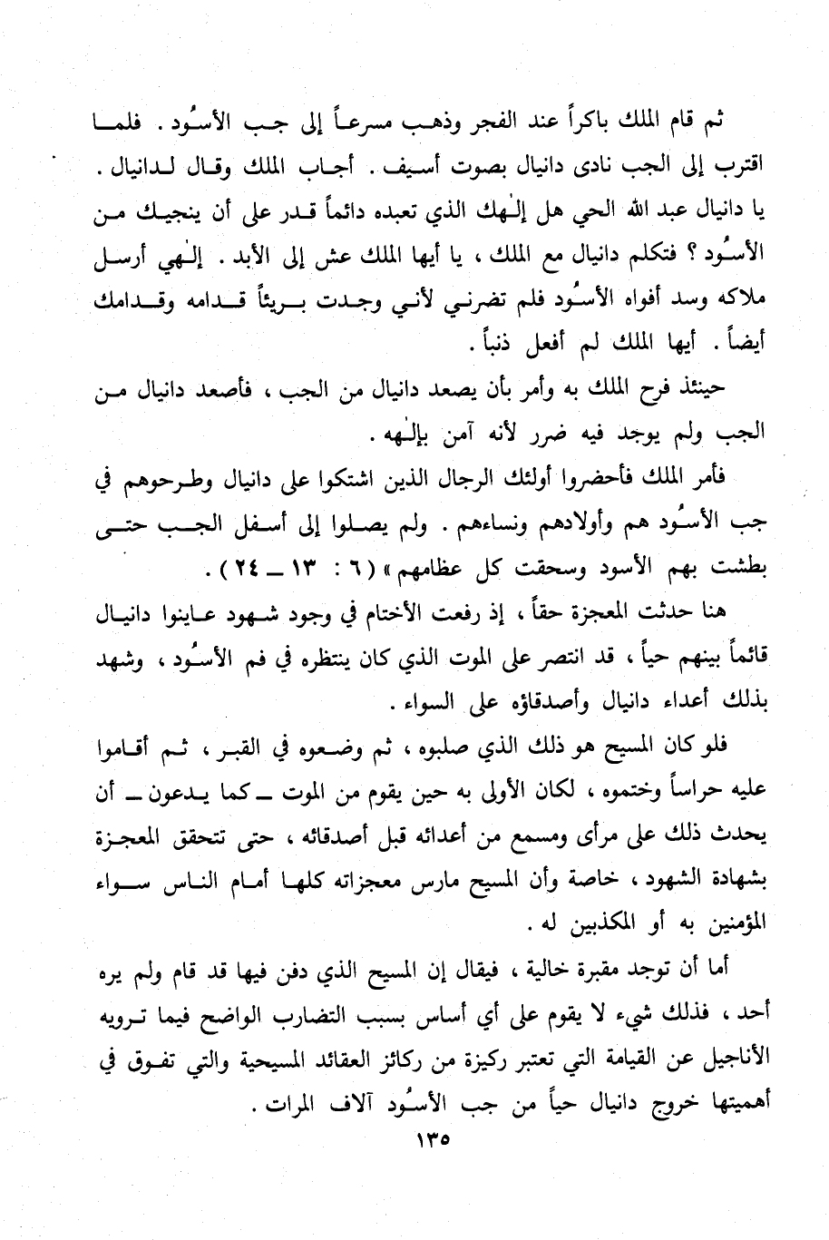 ثم قام الملك باكراً عند الفجر وذهب مسرعاً إلى جب الأسوُد. فلما اقترب إلى الجب نادى دانيال بصوت أسيف. أجاب الملك وقال لدانيال. يا دانيال عبد الله الحي هل إلهك الذي تعبده دائماً قدر على أن ينجيك من الأسوُد؟ فتكلم دانيال مع الملك، يا أيها الملك عش إلى الأبد. إلهي أرسل ملاكه وسد أفواه الأسوُد فلم تضرني لأني وجدت بريئاً قدامه وقدامك أيضا. أيها الملك لم أفعل ذنباً.