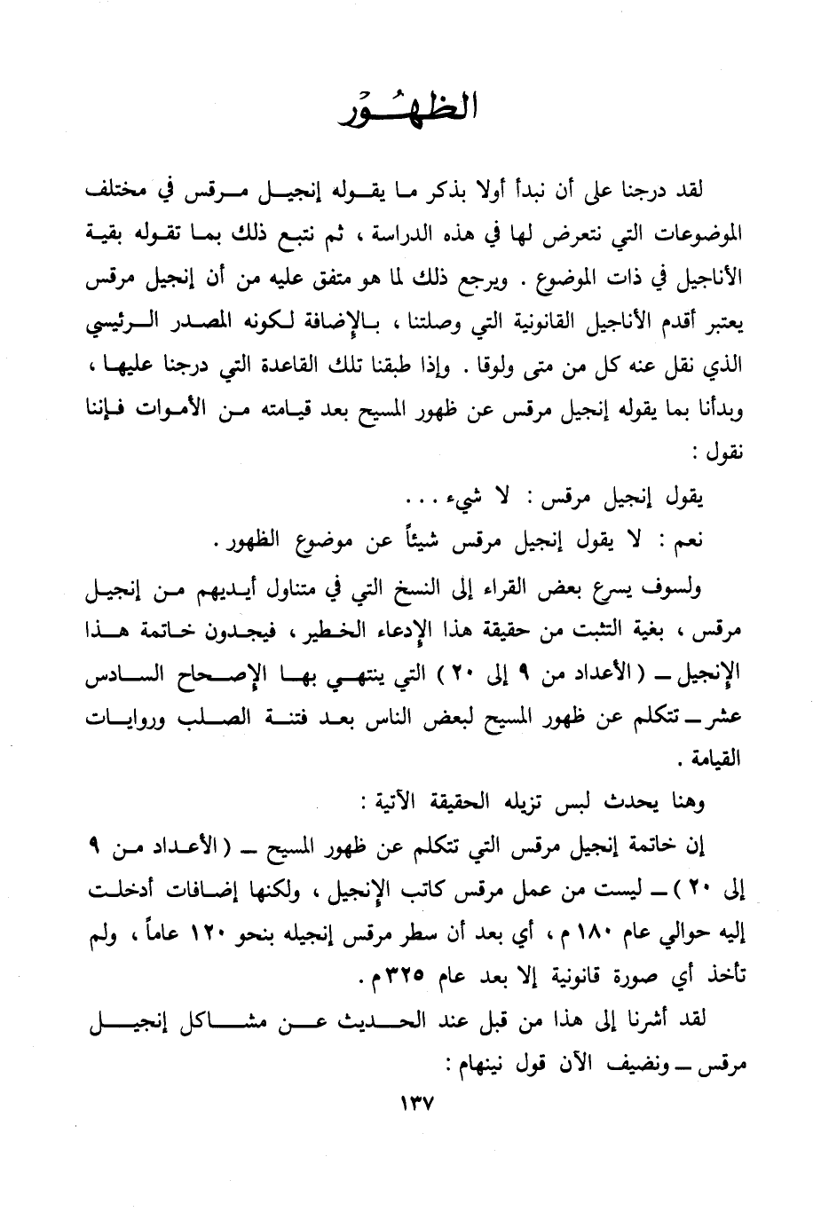 ولسوف يسرع بعض القراء إلى النسخ التي في متناول أيديهم من إنجيل مرقس، بغية التثبت من حقيقة هذا الإدعاء الخطير، فيجدون خاتمة هذا الإنجيل - (الأعداد من 9 إلى 20) التي ينتهي بها الإصحاح السادس عشر - تتكلم عن ظهور المسيح لبعض الناس بعد فتنة الصلب وروايات القيامة.