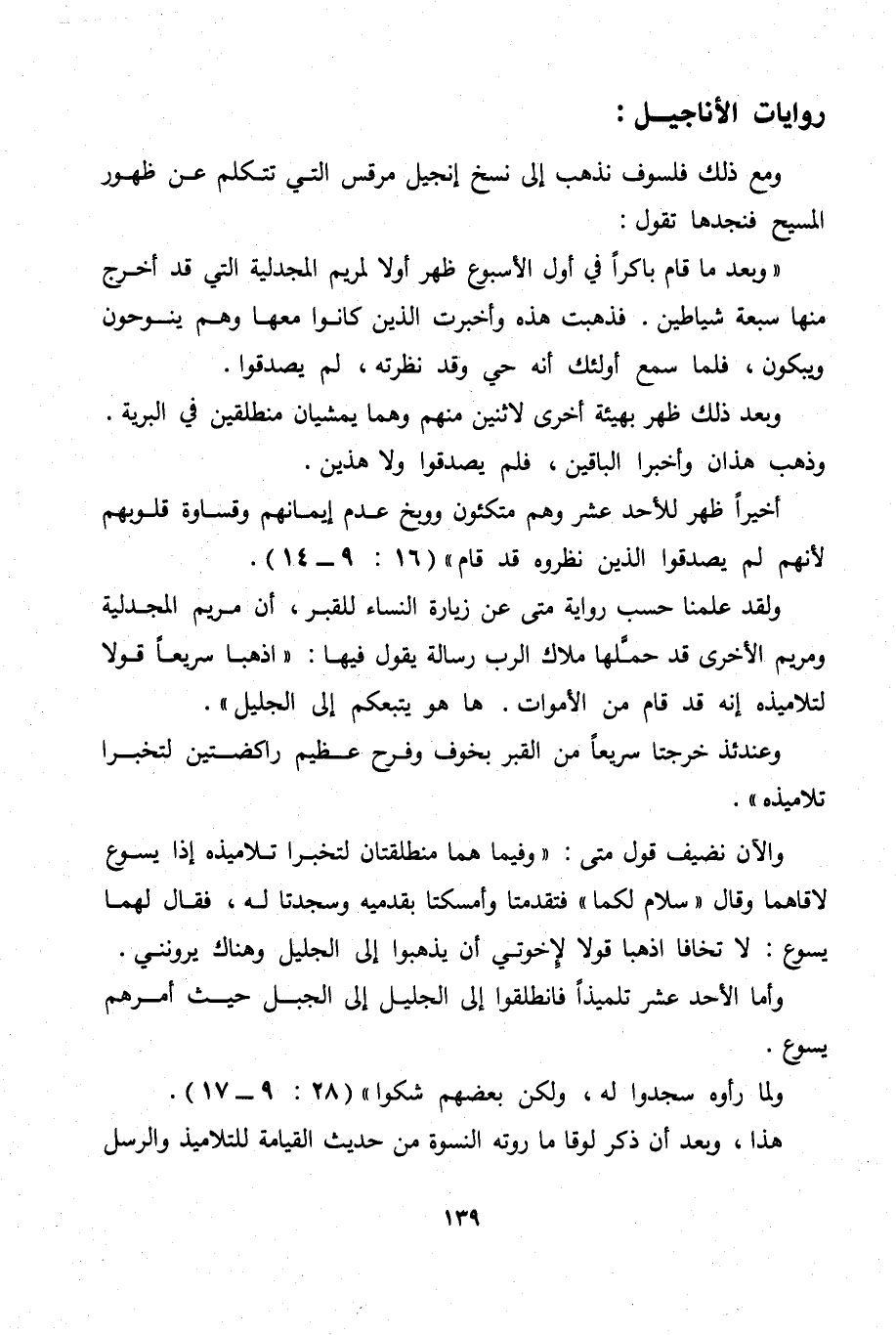 " وبعد ما قام باكراً في أول الأسبوع ظهر أولا لمريم المجدلية التي قد أخرج منها سبعة شياطين. فذهبت هذه وأخبرت الذين كانوا معها وهم ينوحون ويبكون، فلما سمع أولئك أنه حي وقد نظرته، لم يصدقوا.