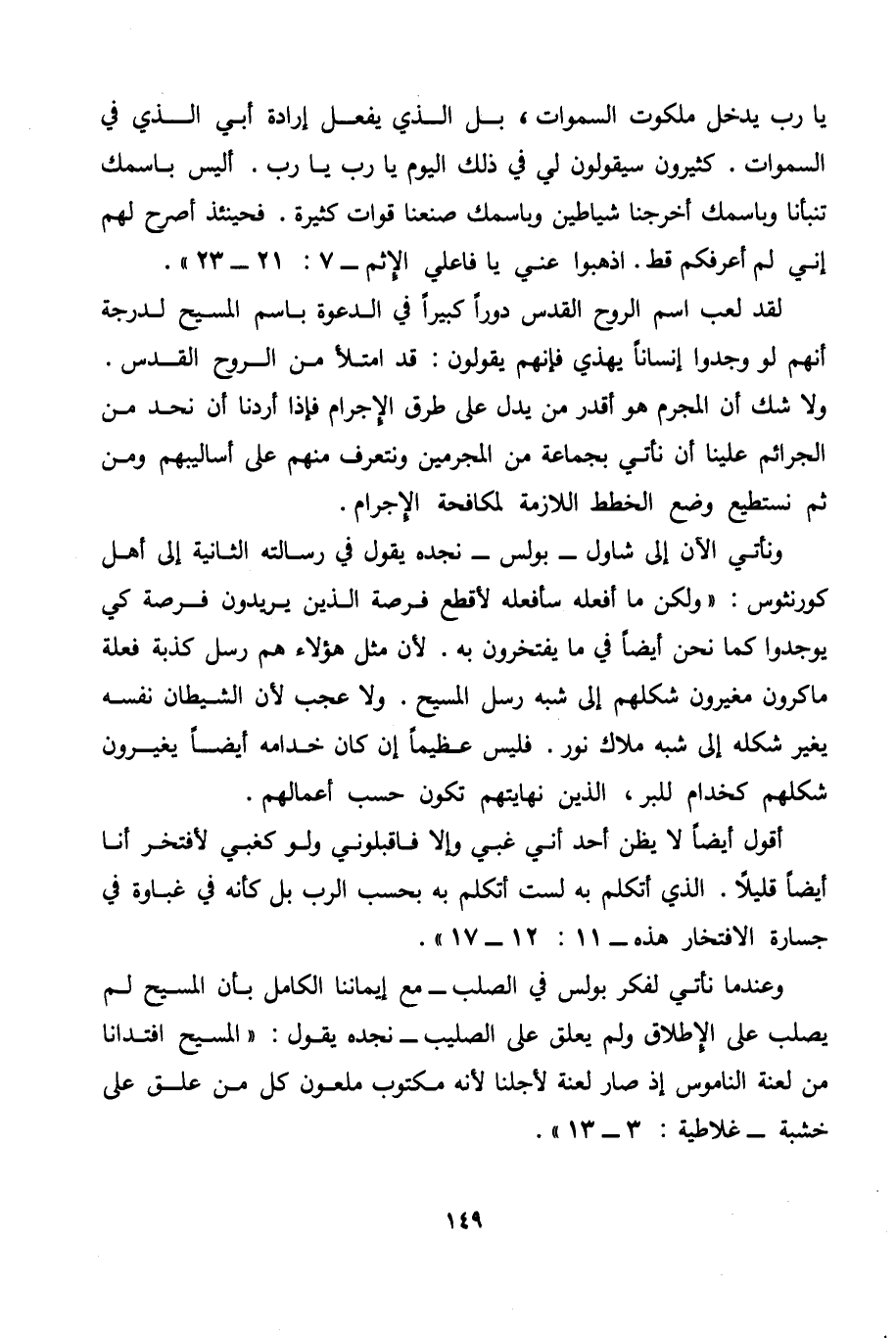يا رب يدخل ملكوت السموات، بل الذي يفعل إرادة أبي الذي في السموات. كثيرون سيقولون لي في ذلك اليوم يا رب يا رب. أليس باسمك تنبأنا وباسمك أخرجنا شياطين ولاسمك صنعنا قوات كثيرة. فحينئذ أصرح لهم إني لم أعرفكم قط. اذهبوا عني يا فاعلي الإثم -7: 21 -23 ".