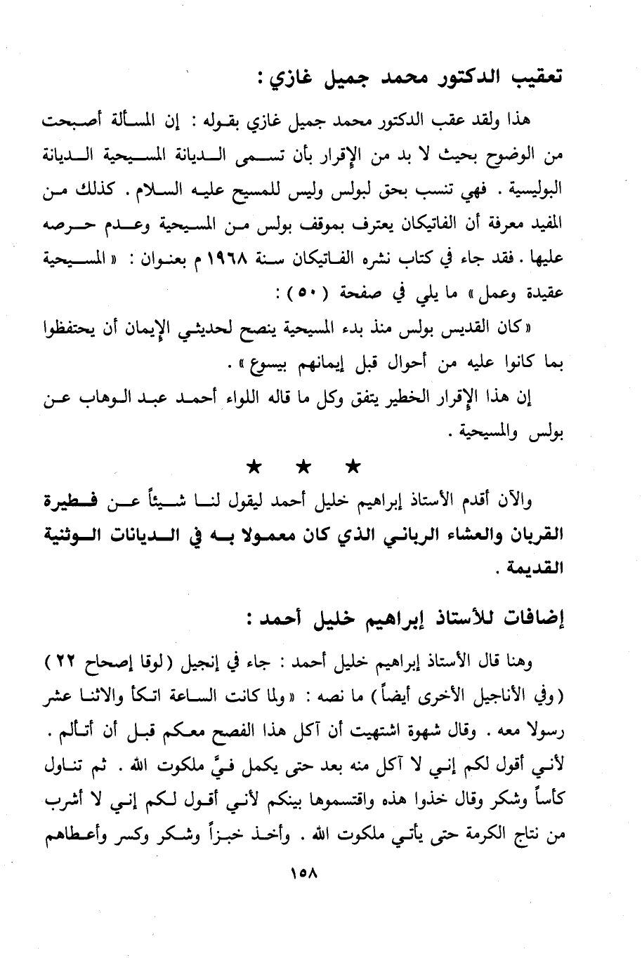 إن هذا الإقرار الخطير يتفق وكل ما قاله اللواء أحمد عبد الوهاب عن بولس والمسيحية. والآن أقدم الأستاذ إبراهيم خليل أحمد ليقول لنا شيئا عن فطيرة القربان والعشاء الرباني الذي كان معمولا به في الديانات الوثنية القديمة.