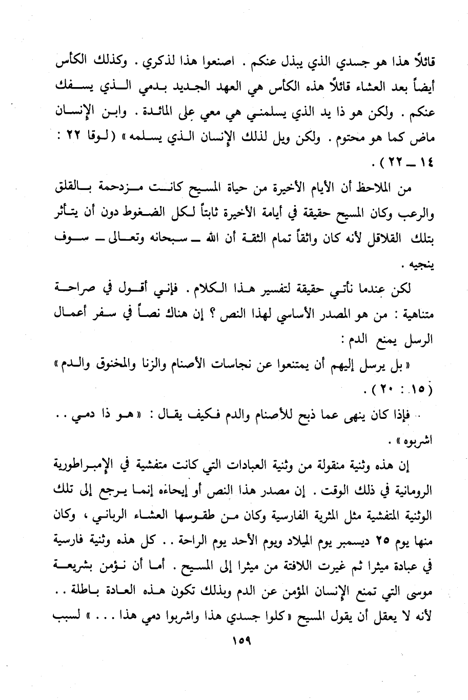 إن هذه وثنية منقولة من وثنية العبادات التي كانت متفشية في الإمبراطورية الرومانية في ذلك الوقت. إن مصدر هذا النص أو إيحاءه إنما يرجع إلى تلك الوثنية المتفشية مثل المثرية الفارسية وكان من طقوسها العشاء الرباني، وكان منها يوم 25 ديسمبر يوم الميلاد ويوم الأحد يوم الراحة. . كل هذه وثنية فارسية في عبادة ميثرا ثم غيرت اللافتة من ميثرا إلى المسيح. أما أن نؤمن بشريعة موسى التي تمنع الإنسان المؤمن عن الدم وبذلك تكون هذه العادة باطلة. . لأنه لا يعقل أن يقول المسيح " كلوا جسدي هذا واشربوا دمي هذا. . . " لسبب