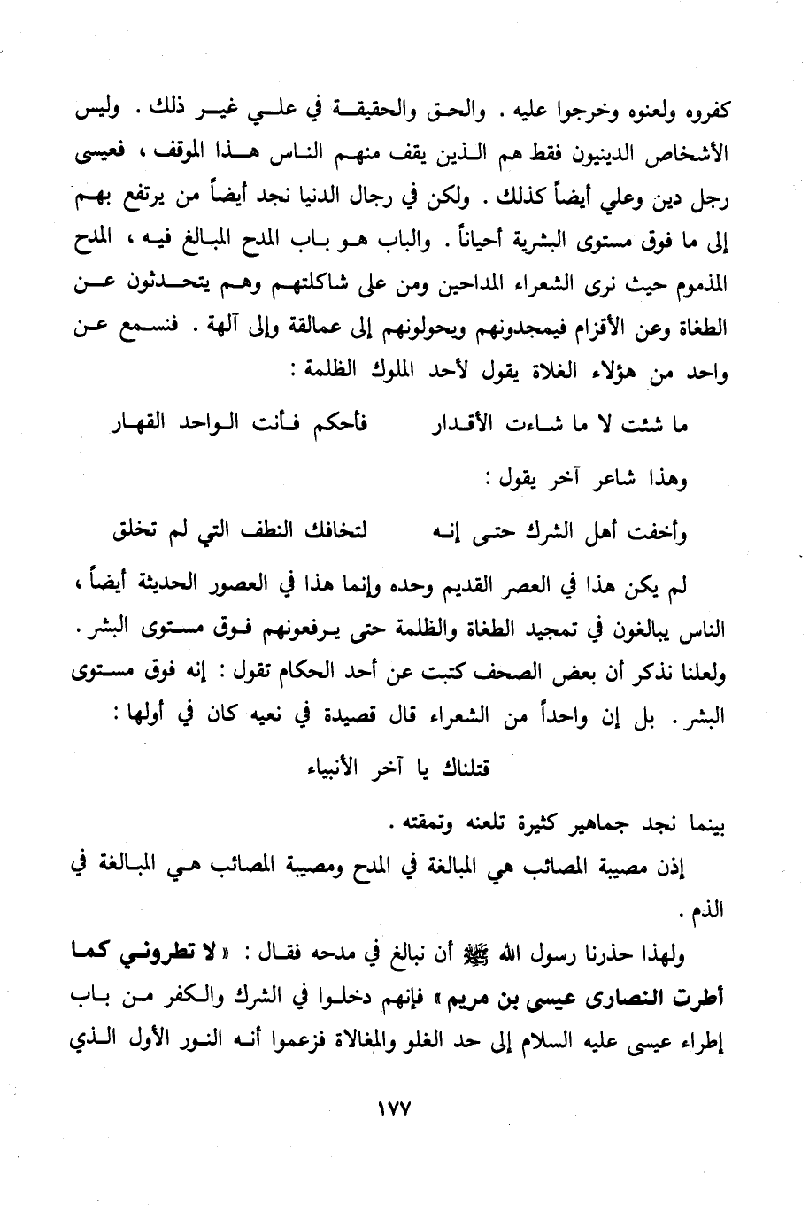 كفروه ولعنوه وخرجوا عليه. والحق والحقيقة في علي غير ذلك. وليس الأشخاص الدينيون فقط هم الذين يقف منهم الناس هذا الموقف، فعيسى رجل دين وعلي أيضا كذلك. ولكن في رجال الدنيا نجد أيضا من يرتفع بهم إلى ما فوق مستوى البشرية أحيانا. والباب هو باب المدح المبالغ فيه، المدح المذموم حيث نرى الشعراء المداحين ومن على شاكلتهم وهم يتحدثون عن الطغاة وعن الأقزام فيمجدونهم ويحولونهم إلى عمالقة وإلى آلهة. فنسمع عن واحد من هؤلاء الغلاة يقول لأحد الملوك الظلمة: