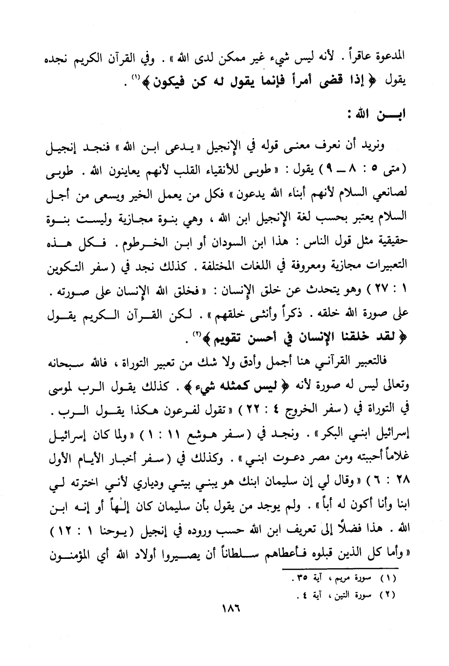 فالتعبير القرآني هنا أجمل وأدق ولا شك من تعبير التوراة، فالله سبحانه وتعالى ليس له صورة لأنه {لَيْسَ كَمِثْلِهِ شَيْءٌ} . كذلك يقول الرب لموسى في التوراة في (سفر الخروج 4: 22) " تقول لفرعون هكذا يقول الرب. إسرائيل ابني البكر ". ونجد في (سفر هوشع 11: 1) " ولما كان إسرائيل غلاما أحببته ومن مصر دعوت ابني ". وكذلك في (سفر أخبار الأيام الأول 28: 6) " وقال لي إن سليمان ابنك هو يبني بيتي ودياري لأني اخترته لي ابنا وأنا أكون له أبا ". ولم يوجد من يقول بأن سليمان كان إلها أو إنه ابن الله. هذا فضلا إلى تعريف ابن الله حسب وروده في إنجيل (يوحنا 1: 12) " وأما كل الذين قبلوه فأعطاهم سلطانا أن يصيروا أولاد الله أي المؤمنون