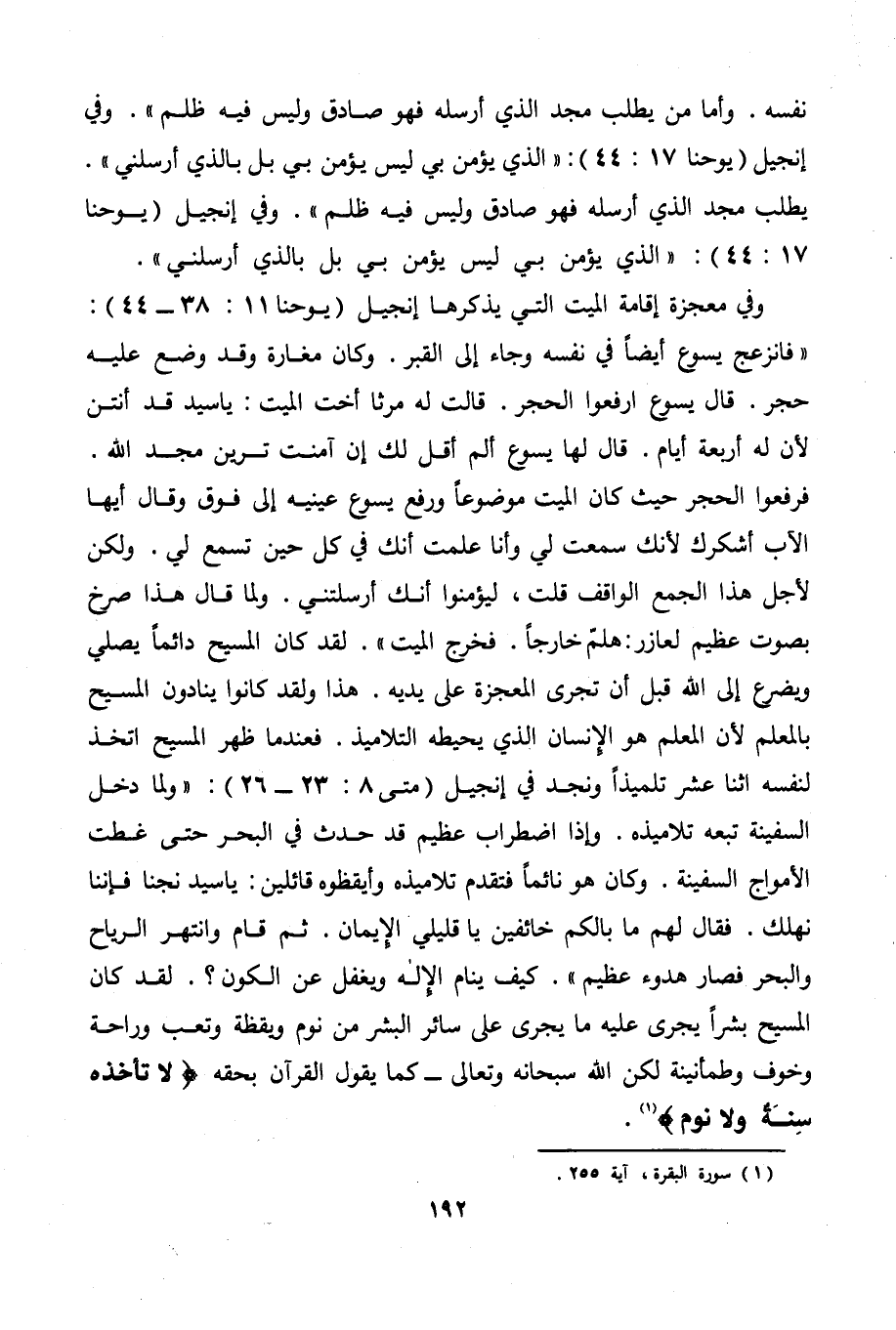. كيف ينام الإله ويغفل عن الكون؟ . لقد كان المسيح بشرا يجرى عليه ما يجرى على سائر البشر من نوم ويقظة وتعب وراحة وخوف وطمأنينة لكن الله سبحانه وتعالى - كما يقول القرآن بحقه {لَا تَأْخُذُهُ سِنَةٌ وَلَا نَوْمٌ} (¬1) .