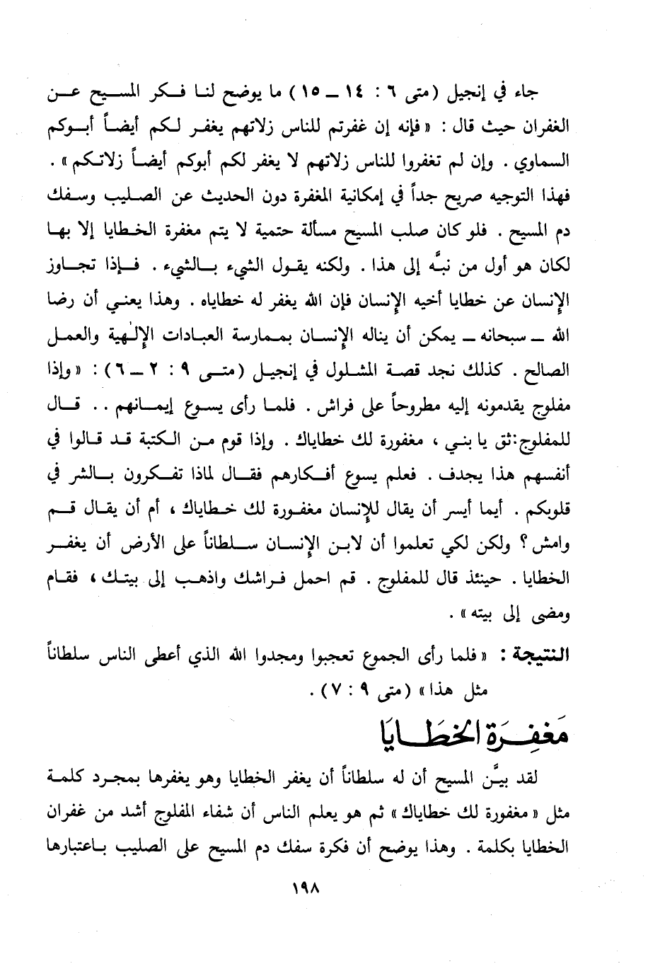 جاء في إنجيل (متى 6: 14-15) ما يوضح لنا فكر المسيح عن الغفران حيث قال: " فإنه إن غفرتم للناس زلاتهم يغفر لكم أيضا أبوكم السماوي. وإن لم تغفروا للناس زلاتهم لا يغفر لكم أبوكم أيضا زلاتكم ". فهذا التوجيه صريح جدًا في إمكانية المغفرة دون الحديث عن الصليب وسفك دم المسيح. فلو كان صلب المسيح مسألة حتمية لا يتم مغفرة الخطايا إلا بها لكان هو أول من نبه إلى هذا. ولكنه يقول الشيء بالشيء. فإذا تجاوز الإنسان عن خطايا أخيه الإنسان فإن الله يغفر له خطاياه. وهذا يعني أن رضا الله- سبحانه- يمكن أن يناله الإنسان بممارسة العبادات الإلهية والعمل الصالح. كذلك نجد قصة المشلول في إنجيل (متى 9: 2- 6) : " وإذا مفلوج يقدمونه إليه مطروحًا على فراش. فلما رأى يسوع إيمانهم. . قال للمفلوج: ثق يا بني، مغفورة لك خطاياك. وإذا قوم من الكتبة قد قالوا في أنفسهم هذا يجدف. فعلم يسوع أفكارهم فقال لماذا تفكرون بالشر في قلوبكم. أيما أيسر أن يقال للإنسان مغفورة لك خطاياك، أم أن يقال قم وامش؟ ولكن لكي تعلموا أن لابن الإنسان سلطانًا على الأرض أن يغفر الخطايا. حينئذ قال للمفلوج. قم احمل فراشك واذهب إلى بيتك،