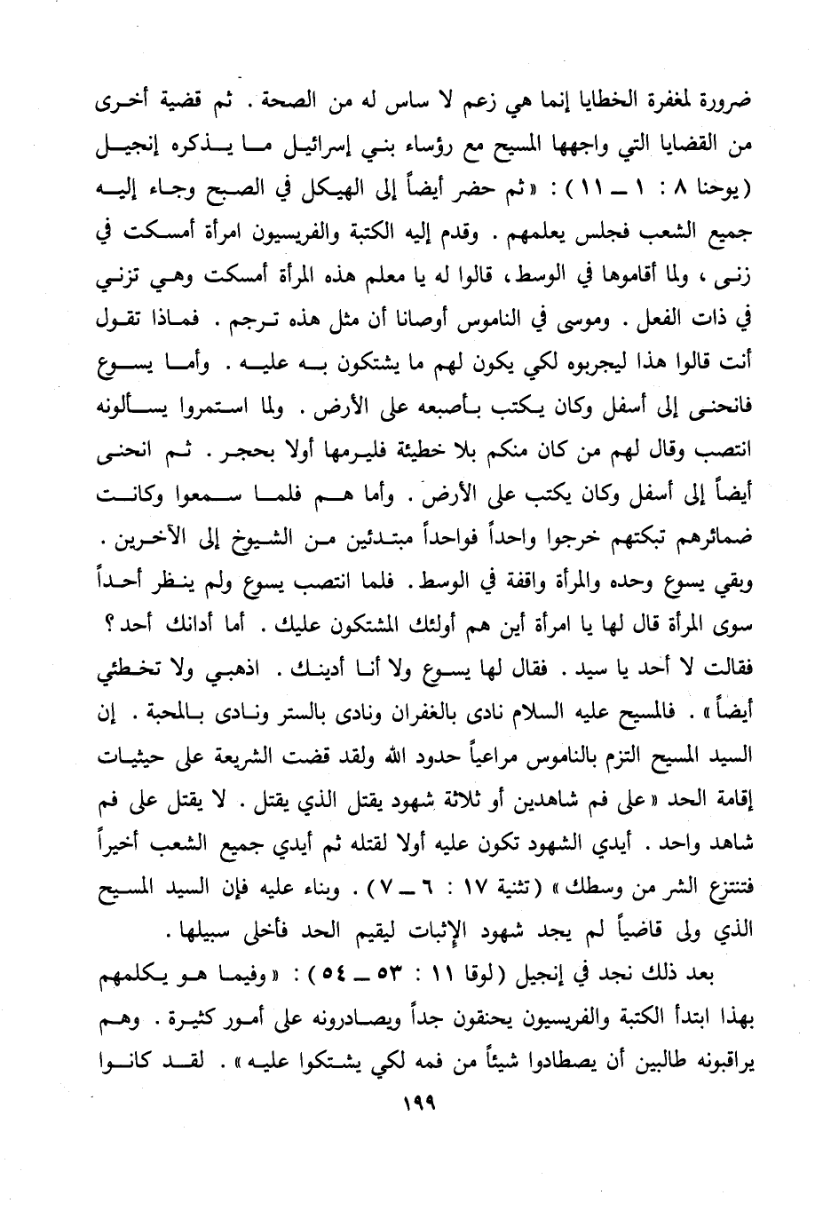 ضرورة لمغفرة الخطايا إنما هي زعم لا أساس له من الصحة. ثم قضية أخرى من القضايا التي واجهها المسيح مع رؤساء بني إسرائيل ما يذكره إنجيل (يوحنا 8: 1- 11) : " ثم حضر أيضا إلى الهيكل في الصبح وجاء إليه جميع الشعب فجلس يعلمهم. وقدم إليه الكتبة والفريسيون امرأة أمسكت في زنى، ولما أقاموها في الوسط، قالوا له يا معلم هذه المرأة أمسكت وهي تزني في ذات الفعل. وموسى في الناموس أوصانا أن مثل هذه ترجم. فماذا تقول أنت قالوا هذا ليجربوه لكي يكون لهم ما يشتكون به عليه. وأما يسوع فانحنى إلى أسفل وكان يكتب بأصبعه على الأرض. ولما استمروا يسألونه انتصب وقال لهم من كان منكم بلا خطيئة فليرمها أولا بحجر. ثم انحنى أيضا إلى أسفل وكان يكتب على الأرض. وأما هم فلما سمعوا وكانت ضمائرهم تبكتهم خرجوا واحدًا فواحدًا مبتدئين من الشيوخ إلى الآخرين. وبقي يسوع وحده والمرأة واقفة في الوسط. فلما