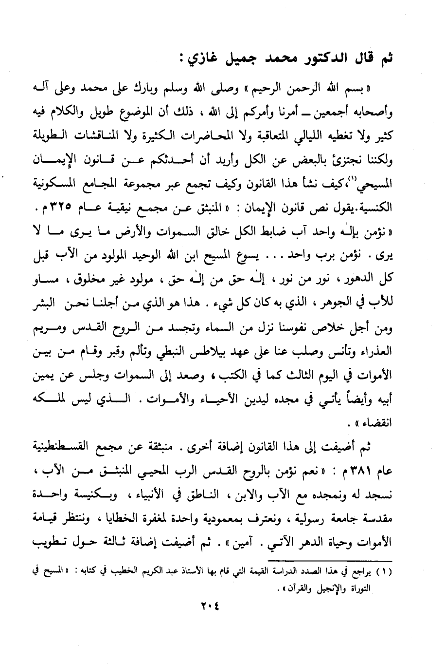 " بسم الله الرحمن الرحيم " وصلى الله وسلم وبارك على محمد وعلى آله وأصحابه أجمعين- أمرنا وأمركم إلى الله، ذلك أن الموضوع طويل والكلام فيه كثير، ولا تغطيه الليالي المتعاقبة ولا المحاضرات الكثيرة ولا المناقشات الطويلة، ولكننا نجتزئ بالبعض عن الكل وأريد أن أحدثكم عن قانون الإيمان المسيحي (¬1) ، كيف نشأ هذا القانون وكيف تجمع عبر مجموعة المجامع المسكونية الكنسية. يقول نص قانون الإيمان: " المنبثق عن مجمع نيقية عام 325 م. " نؤمن بإله واحد آب ضابط الكل خالق السماوات والأرض ما يرى ما لا يرى. نؤمن برب واحد. . . يسوع المسيح ابن الله الوحيد المولود من الآب قبل كل الدهور، نور من نور، إله حق من إله حق، مولود غير مخلوق، مساو للأب في الجوهر، الذي به كان كل شيء. هذا هو الذي من أجلنا نحن البشر ومن أجل خلاص نفوسنا نزل من السماء وتجسد من الروح القدس ومريم العذراء وتأنس وصلب عنا على عهد بيلاطس النبطي وتألم وقبر وقام من بين الأموات في اليوم الثالث كما في الكتب، وصعد إلى السماوات وجلس عن يمين أبيه وأيضا يأتي في مجده ليدين الأحياء والأموات. الذي ليس لملكه انقضاء ".