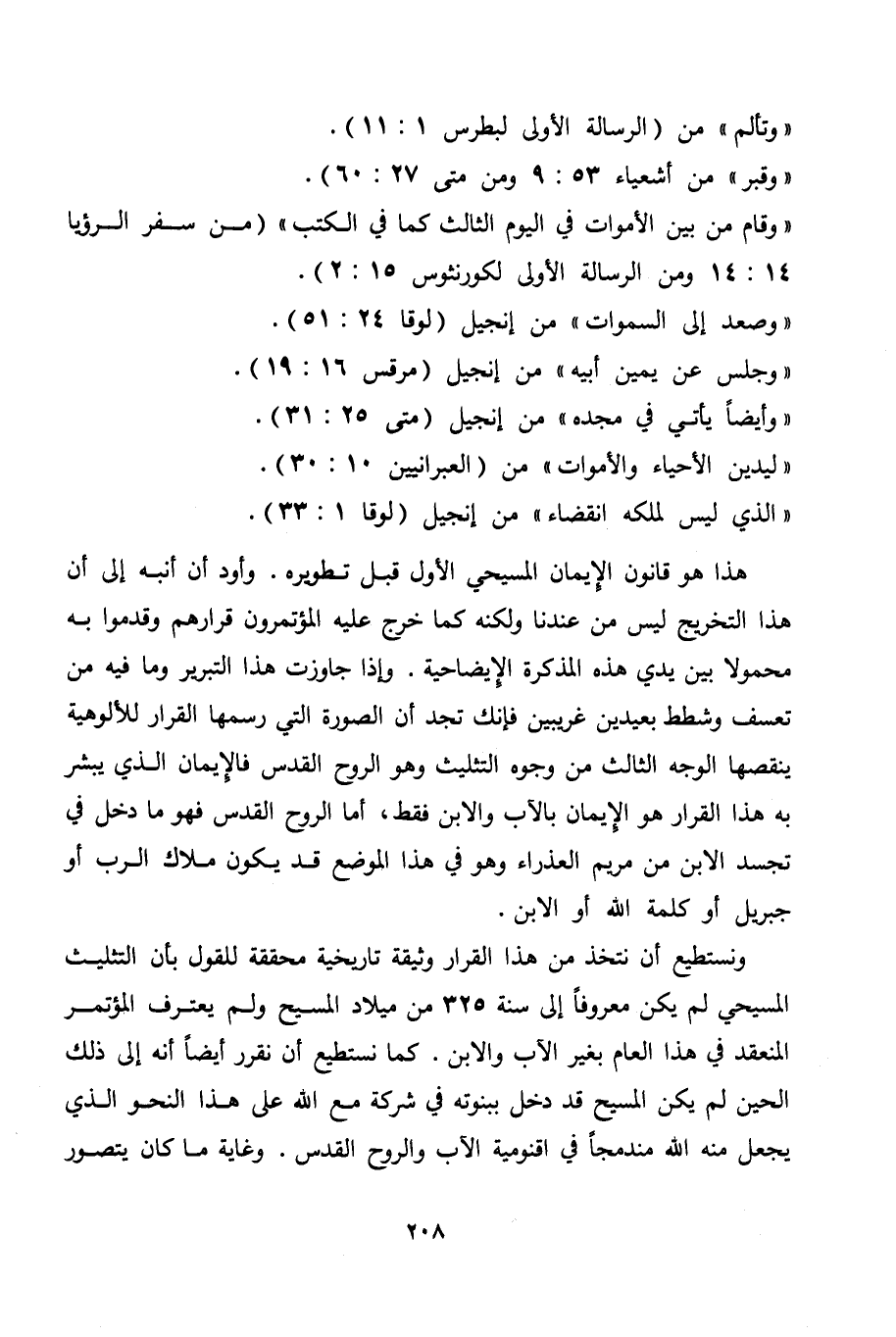 هذا هو قانون الإيمان المسيحي الأول قبل تطويره. وأود أن أنبه إلى أن هذا التخريج ليس من عندنا ولكنه كما خرج عليه المؤتمرون قرارهم وقدموا به محمولا بين يدي هذه المذكرة الإيضاحية. وإذا جاوزت هذا التبرير وما فيه من تعسف وشطط بعيدين غريبين فإنك تجد أن الصورة التي رسمها القرار للألوهية ينقصها الوجه الثالث من وجوه التثليث وهو الروح القدس فالإيمان الذي يبشر به هذا القرار هو الإيمان بالآب والابن فقط، أما الروح القدس فهو ما دخل في تجسد الابن من مريم العذراء وهو في هذا الموضع قد يكون ملاك الرب أو جبريل أو كلمة الله أو الابن.
