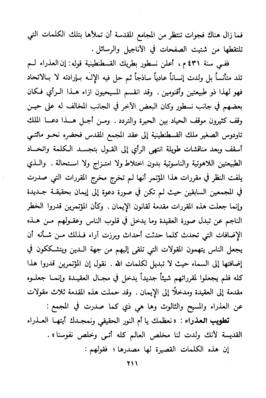 الله. نقول إن المؤتمرين قدروا هذا كله فلم يجعلوا لمقرراتهم شيئًا جديدًا يدخل في مجال العقيدة وإنما جعلوه مقدمة إلى العقيدة ومدخلًا إلى الإيمان. وقد حملت هذه المقدمة ثلاث مقولات عن العذراء والمسيح والثالوث وها هي ذي كما صدرت في المجمع: