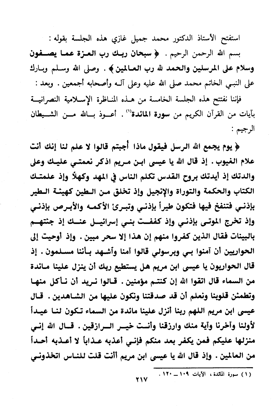بسم الله الرحمن الرحيم. {سُبْحَانَ رَبِّكَ رَبِّ الْعِزَّةِ عَمَّا يَصِفُونَ} {وَسَلَامٌ عَلَى الْمُرْسَلِينَ} {وَالْحَمْدُ لِلَّهِ رَبِّ الْعَالَمِينَ} . وصلى الله وسلم وبارك على النبي الخاتم محمد صلى الله عليه وعلى آله وأصحابه أجمعين. وبعد: فإننا نفتتح هذه الجلسة الخامسة من هذه المناظرة الإسلامية النصرانية بآيات من القرآن الكريم من سورة المائدة. (¬1) أعوذ بالله من الشيطان الرجيم: