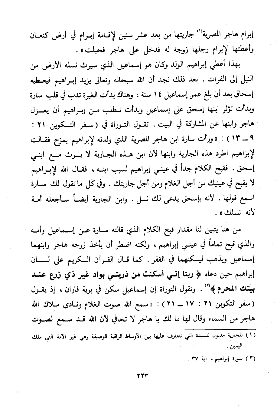 من هنا يتبين لنا مقدار قبح الكلام الذي قالته سارة عن إسماعيل وأمه والذي قبح تمامًا في عيني إبراهيم، ولكنه اضطر أن يأخذ زوجه هاجر وابنهما إسماعيل ويذهب ليسكنهما في القفر. كما قال القرآن الكريم على لسان إبراهيم حين دعاه {رَبَّنَا إِنِّي أَسْكَنْتُ مِنْ ذُرِّيَّتِي بِوَادٍ غَيْرِ ذِي زَرْعٍ عِنْدَ بَيْتِكَ الْمُحَرَّمِ} . (¬2) وتقول التوراة إن إسماعيل سكن في برية فاران، إذ يقول (سفر التكوين 21: 17- 21) : " سمع الله صوت الغلام ونادى ملاك الله هاجر من السماء وقال لها ما لك يا هاجر لا تخافي لأن الله قد سمع لصوت