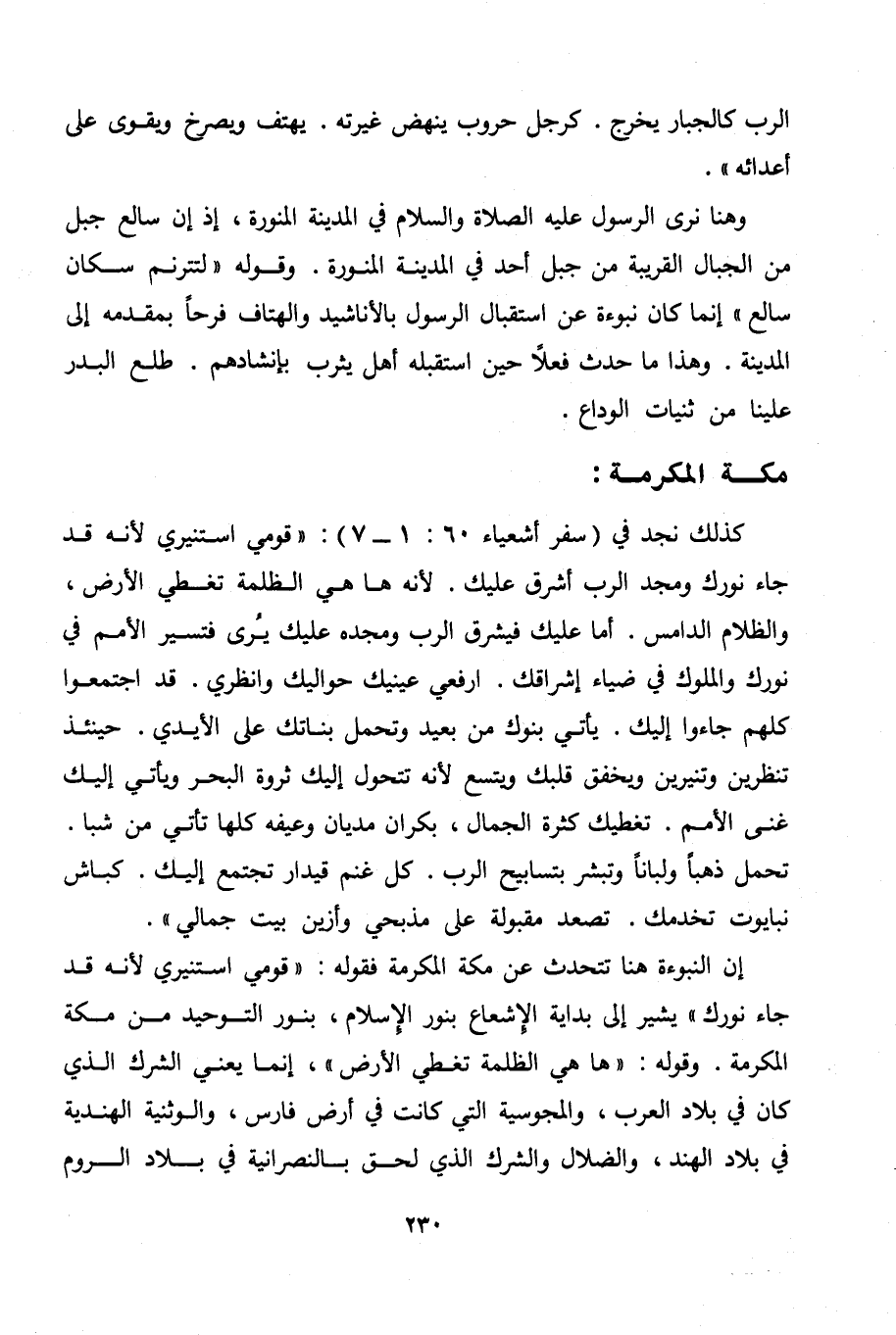 إن النبوءة هنا تتحدث عن مكة المكرمة فقوله: " قومي استنيري لأنه قد جاء نورك " يشير إلى بداية الإشعاع بنور الإسلام، بنور التوحيد من مكة المكرمة. وقوله: " ها هي الظلمة تغطي الأرض "، إنما يعني الشرك الذي كان في بلاد العرب، والمجوسية التي كانت في أرض فارس، والوثنية الهندية في بلاد الهند، والضلال والشرك الذي لحق بالنصرانية في بلاد الروم