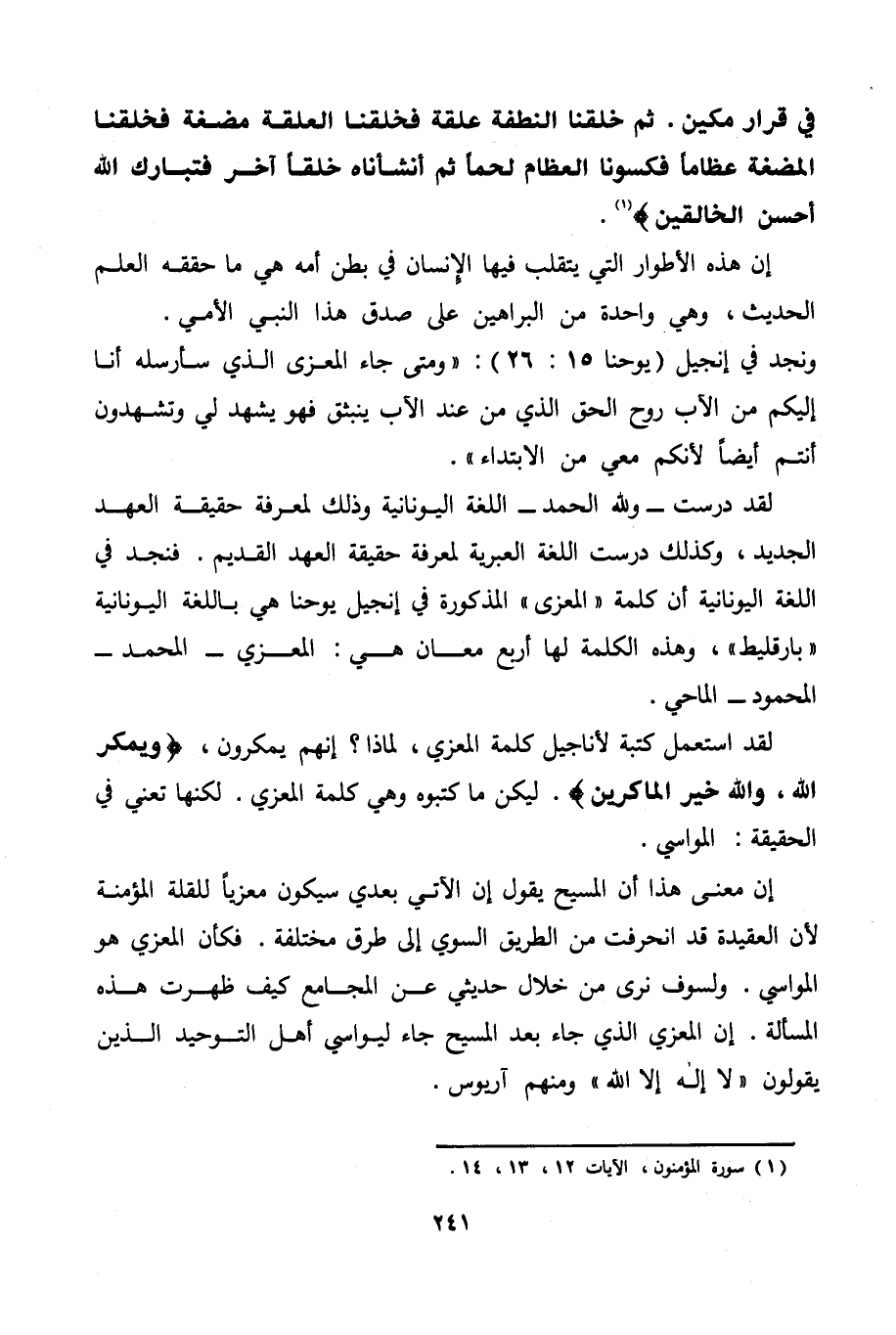 لقد درست- ولله الحمد- اللغة اليونانية وذلك لمعرفة حقيقة العهد الجديد، وكذلك درست اللغة العبرية لمعرفة حقيقة العهد القديم. فنجد في اللغة اليونانية أن كلمة " المعزي " المذكورة في إنجيل يوحنا هي باللغة اليونانية (بارقليط) ، وهذه الكلمة لها أربع معان هي: المعزي- المحمد- المحمود- الماحي.