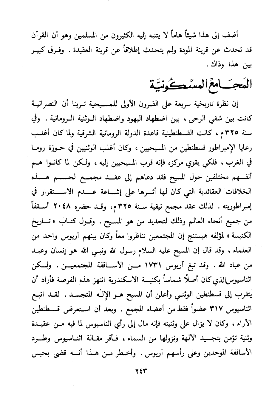 المجامع المسكونية إن نظرة تاريخية سريعة على القرون الأولى للمسيحية ترينا أن النصرانية كانت بين شقي الرحى، بين اضطهاد اليهود واضطهاد الوثنية الرومانية. وفي سنة 325 م، كانت القسطنطينية قاعدة الدولة الرومانية الشرقية ولما كان أغلب رعايا الإمبراطور قسطنطين من المسيحيين، وكان أغلب الوثنيين في حوزة روما في الغرب، فلكي يقوي مركزه فإنه قرب المسيحيين إليه، ولكن لما كانوا هم أنفسهم مختلفين حول المسيح فقد دعاهم إلى عقد مجمع لحسم هذه الخلافات العقائدية التي كان لها أثرها على إشاعة عدم الاستقرار في إمبراطوريته. لذلك عقد مجمع نيقية سنة 325 م، وقد حضره 2048 أسقفًا من جميع أنحاء العالم وذلك لتحديد من هو المسيح. وقول كتاب " تاريخ الكنيسة " لمؤلفه هيستنج إن المجتمعين تناظروا معًا وكان بينهم آريوس واحد من العلماء، وقد قال إن المسيح - عليه السلام - رسول الله ونبي الله هو إنسان وعبد من عباد الله. وقد تبع آريوس 1731 من الأساقفة المجتمعين. ولكن اثناسيوس الذي كان أصلًا شماسًا بكنيسة الإسكندرية انتهز هذه الفرصة فأراد أن يتقرب إلى قسطنطين الوثني وأعلن أن المسيح هو الإله المتجسد. لقد اتبع اثناسيوس