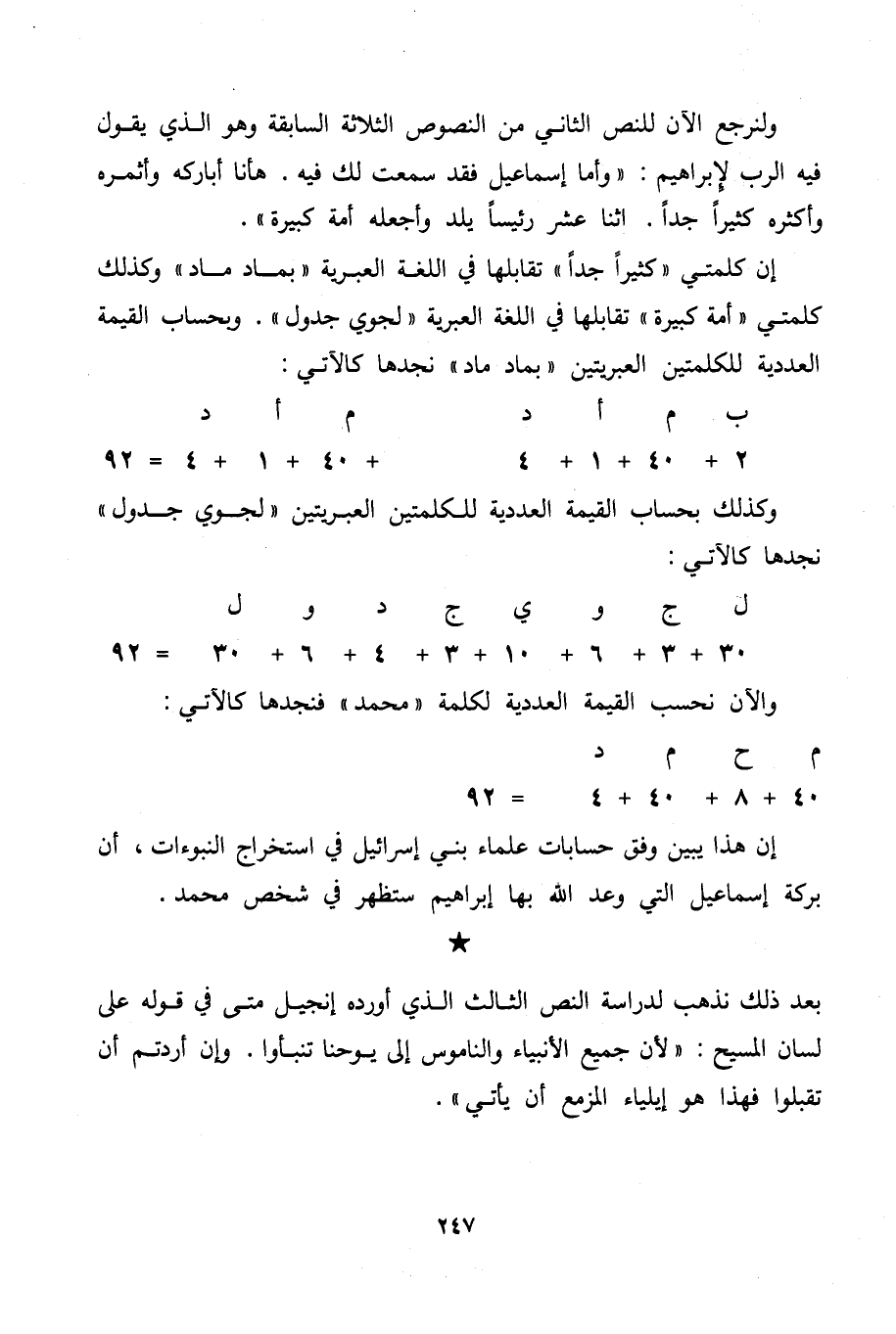 م ح م د 40 + 8 + 40 + 4 = 92 إن هذا يبين وفق حسابات علماء بني إسرائيل في استخراج النبوءات، أن بركة إسماعيل التي وعد الله بها إبراهيم ستظهر في شخص محمد.