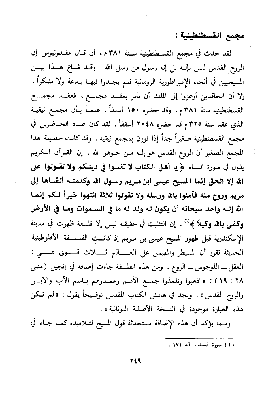 لقد حدث في مجمع القسطنطينية سنة 381 م، أن قال مقدونيوس إن الروح القدسي ليس بإله بل إنه رسول من رسل الله. وقد شاع هذا بين المسيحيين في أنحاء الإمبراطورية الرومانية فلم يجدوا فيها بدعة ولا منكرًا. إلا أن الحاقدين أوعزوا إلى الملك أن يأمر بعقد مجمع، فعقد مجمع القسطنطينية سنة 381 م، وقد حضره 150 أسقفا، علمًا بأن مجمع نيقية الذي عقد سنة 325 م قد حضره 2048 أسقفًا. لقد كان عدد الحاضرين في مجمع القسطنطينية صغيرًا جدًا إذا قورن بمجمع نيقية. وقد كانت حصيلة هذا المجمع الصغير أن الروح القدس هو إله من جوهر الله. إن القرآن الكريم يقول في سورة النساء {يَا أَهْلَ الْكِتَابِ لَا تَغْلُوا فِي دِينِكُمْ وَلَا تَقُولُوا عَلَى اللَّهِ إِلَّا الْحَقَّ إِنَّمَا الْمَسِيحُ عِيسَى ابْنُ مَرْيَمَ رَسُولُ اللَّهِ وَكَلِمَتُهُ أَلْقَاهَا إِلَى مَرْيَمَ وَرُوحٌ مِنْهُ فَآمِنُوا بِاللَّهِ وَرُسُلِهِ وَلَا تَقُولُوا ثَلَاثَةٌ انْتَهُوا خَيْرًا لَكُمْ إِنَّمَا اللَّهُ إِلَهٌ وَاحِدٌ سُبْحَانَهُ أَنْ يَكُونَ لَهُ وَلَدٌ لَهُ مَا فِي السَّمَاوَاتِ وَمَا فِي الْأَرْضِ وَكَفَى بِاللَّهِ وَكِيلًا} . (¬1) إن التثليث