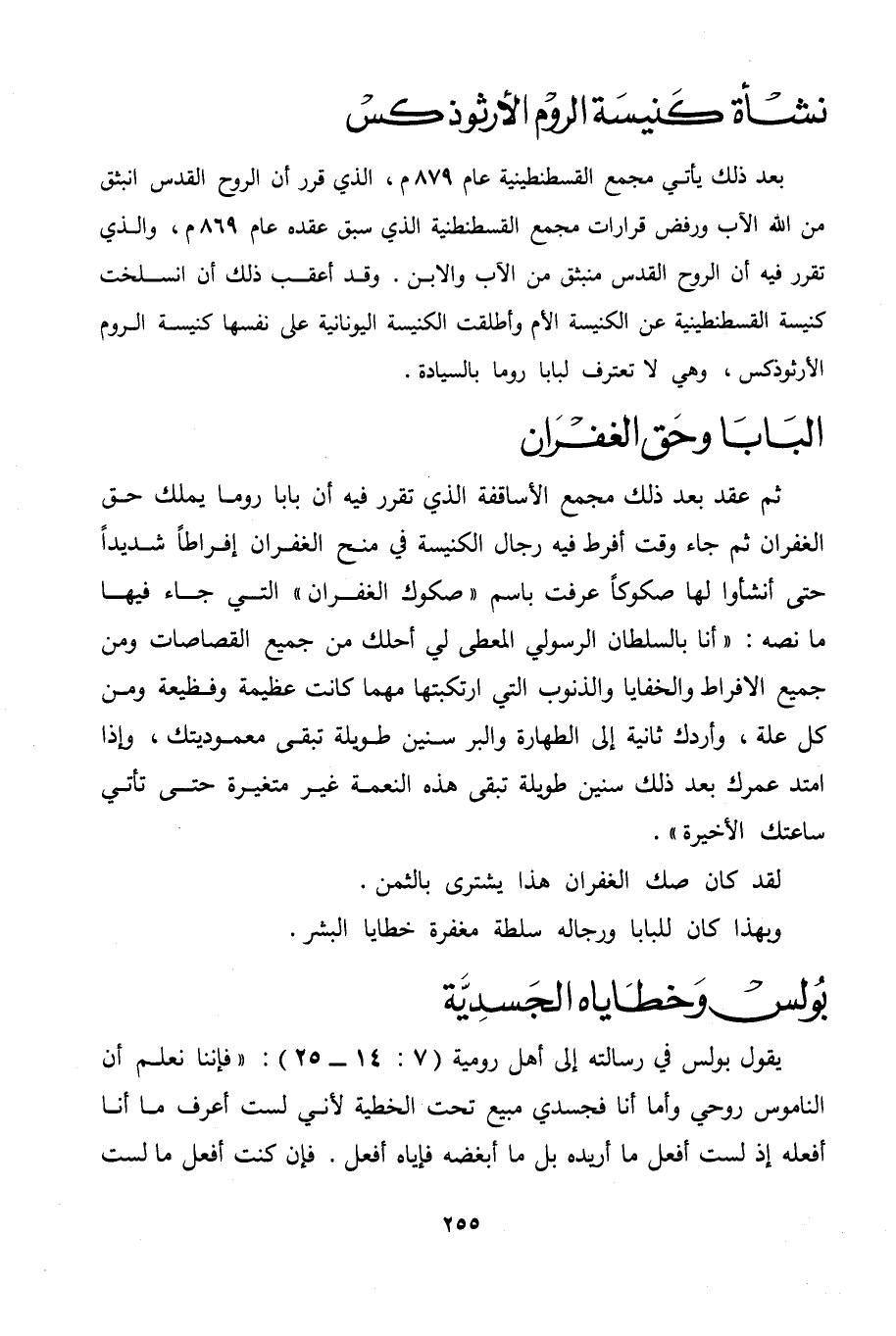 نشأة كنيسة الروم الأرثوذكس بعد ذلك يأتي مجمع القسطنطينية عام 879 م، الذي قرر أن الروح القدس انبثق من الله الآب ورفض قرارات مجمع القسطنطنية الذي سبق عقده عام 869 م، والذي تقرر فيه أن الروح القدس منبثق من الآب والابن. وقد أعقب ذلك أن انسلخت كنيسة القسطنطينية عن الكنيسة الأم وأطلقت الكنيسة اليونانية على نفسها كنيسة الروم الأرثوذكس، وهي لا تعترف لبابا روما بالسيادة.