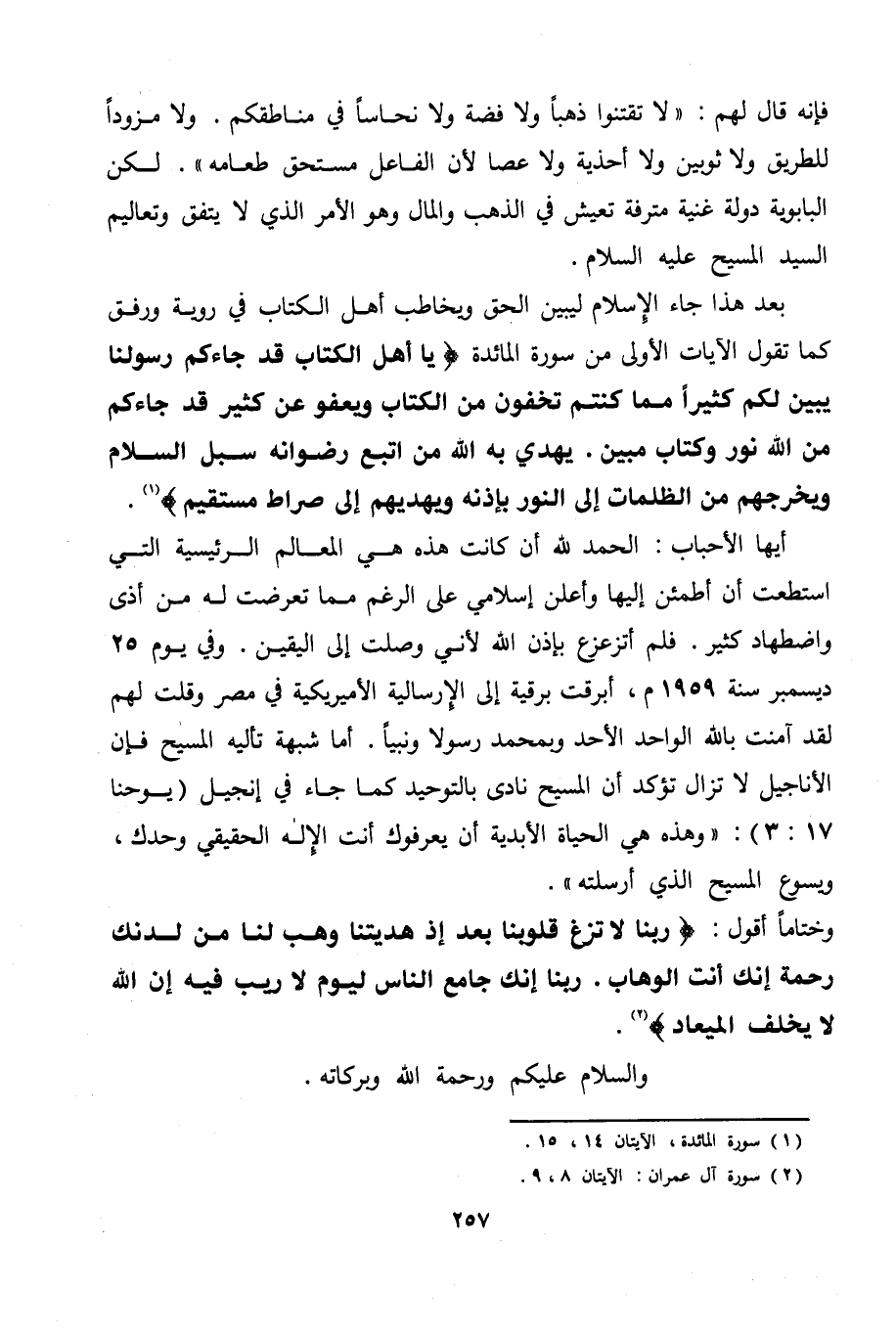 أيها الأحباب: الحمد لله أن كانت هذه هي المعالم الرئيسية التي استطعت أن أطمئن إليها وأعلن إسلامي على الرغم مما تعرضت له من أذى واضطهاد كثير. فلم أتزعزع بإذن الله لأني وصلت إلى اليقين. وفي يوم 25 ديسمبر سنة 1959 م، أبرقت برقية إلى الإرسالية الأميريكية في مصر وقلت لهم لقد آمنت بالله الواحد الأحد وبمحمد رسولا ونبيًا. أما شبهة تأليه المسيح فإن الأناجيل لا تزال تؤكد أن المسيح نادى بالتوحيد كما جاء في إنجيل (يوحنا 17: 3) : " هذه هي الحياة الأبدية أن يعرفوك أنت الإله الحقيقي وحدك، ويسوع المسيح الذي أرسلته ".