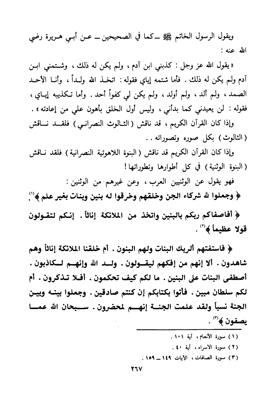 {فَاسْتَفْتِهِمْ أَلِرَبِّكَ الْبَنَاتُ وَلَهُمُ الْبَنُونَ} {أَمْ خَلَقْنَا الْمَلَائِكَةَ إِنَاثًا وَهُمْ شَاهِدُونَ} {أَلا إِنَّهُمْ مِنْ إِفْكِهِمْ لَيَقُولُونَ} {وَلَدَ اللَّهُ وَإِنَّهُمْ لَكَاذِبُونَ} {أَاصْطَفَى الْبَنَاتِ عَلَى الْبَنِينَ} {مَا لَكُمْ كَيْفَ تَحْكُمُونَ} {أَفَلَا تَذَكَّرُونَ} {أَمْ لَكُمْ سُلْطَانٌ مُبِينٌ} {فَأْتُوا بِكِتَابِكُمْ إِنْ كُنْتُمْ صَادِقِينَ} {وَجَعَلُوا بَيْنَهُ وَبَيْنَ الْجِنَّةِ نَسَبًا وَلَقَدْ عَلِمَتِ الْجِنَّةُ إِنَّهُمْ لَمُحْضَرُونَ} {سُبْحَانَ اللَّهِ عَمَّا يَصِفُونَ} . (¬3) .