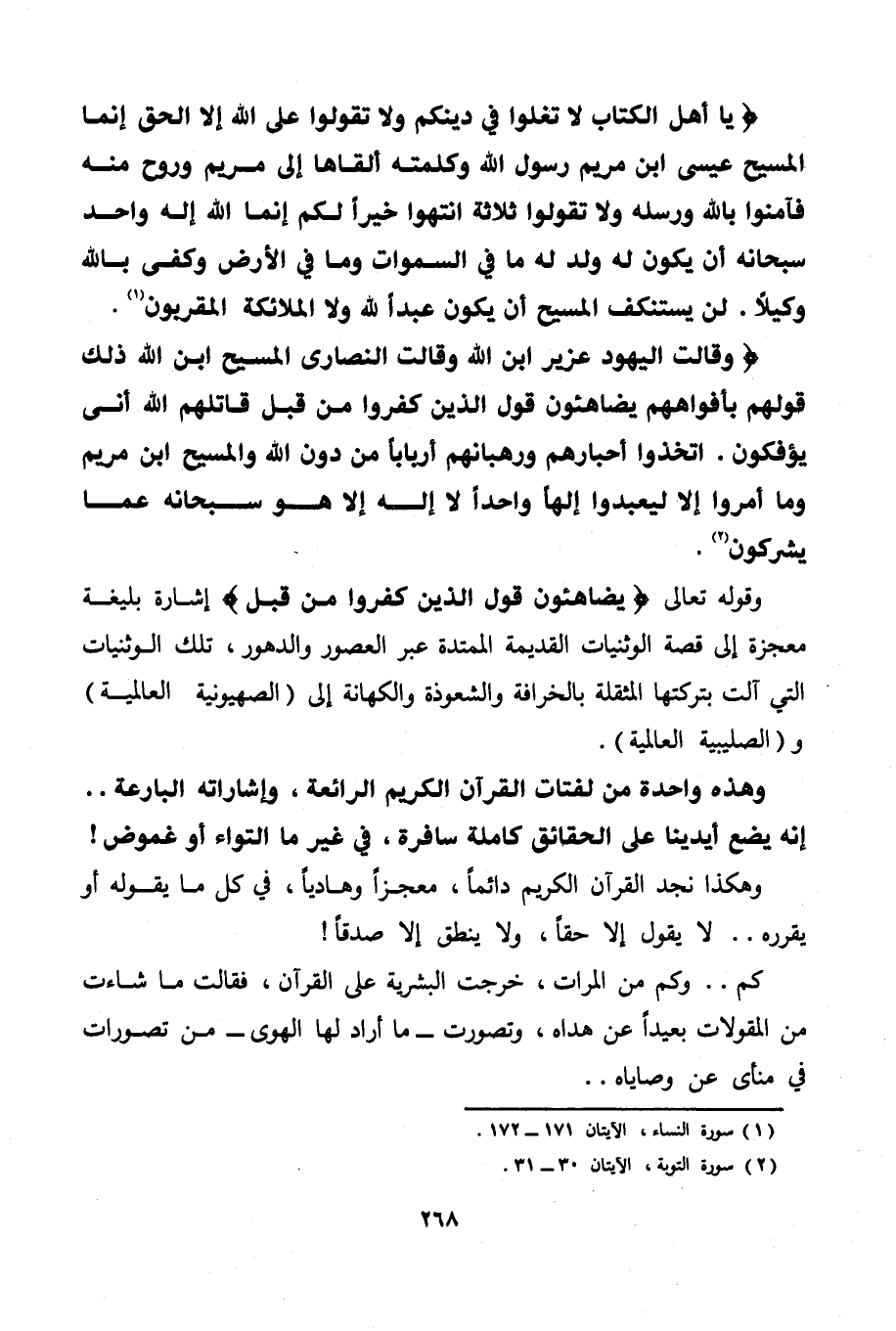 {يَا أَهْلَ الْكِتَابِ لَا تَغْلُوا فِي دِينِكُمْ وَلَا تَقُولُوا عَلَى اللَّهِ إِلَّا الْحَقَّ إِنَّمَا الْمَسِيحُ عِيسَى ابْنُ مَرْيَمَ رَسُولُ اللَّهِ وَكَلِمَتُهُ أَلْقَاهَا إِلَى مَرْيَمَ وَرُوحٌ مِنْهُ فَآمِنُوا بِاللَّهِ وَرُسُلِهِ وَلَا تَقُولُوا ثَلَاثَةٌ انْتَهُوا خَيْرًا لَكُمْ إِنَّمَا اللَّهُ إِلَهٌ وَاحِدٌ سُبْحَانَهُ أَنْ يَكُونَ لَهُ وَلَدٌ لَهُ مَا فِي السَّمَاوَاتِ وَمَا فِي الْأَرْضِ وَكَفَى بِاللَّهِ وَكِيلًا} {لَنْ يَسْتَنْكِفَ الْمَسِيحُ أَنْ يَكُونَ عَبْدًا لِلَّهِ وَلَا الْمَلَائِكَةُ الْمُقَرَّبُونَ} . (¬1) .