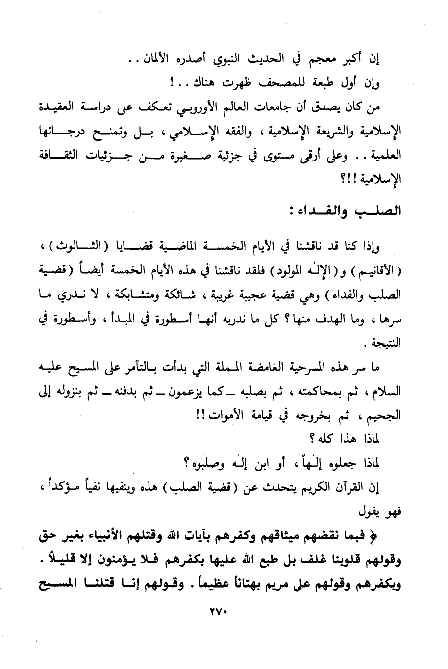 إن القرآن الكريم يتحدث عن (قضية الصلب) هذه وينفيها نفيًا مؤكدًا، فهو يقول: