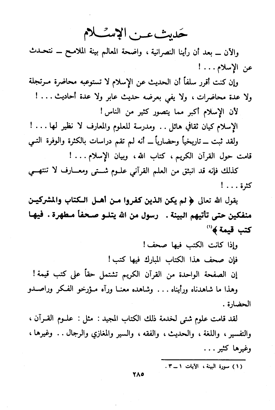 وإن كنت أقرر سلفًا أن الحديث عن الإسلام لا تستوعبه محاضرة مرتجلة ولا عدة محاضرات، ولا يفي بعرضه حديث عابر ولا عدة أحاديث. . .!