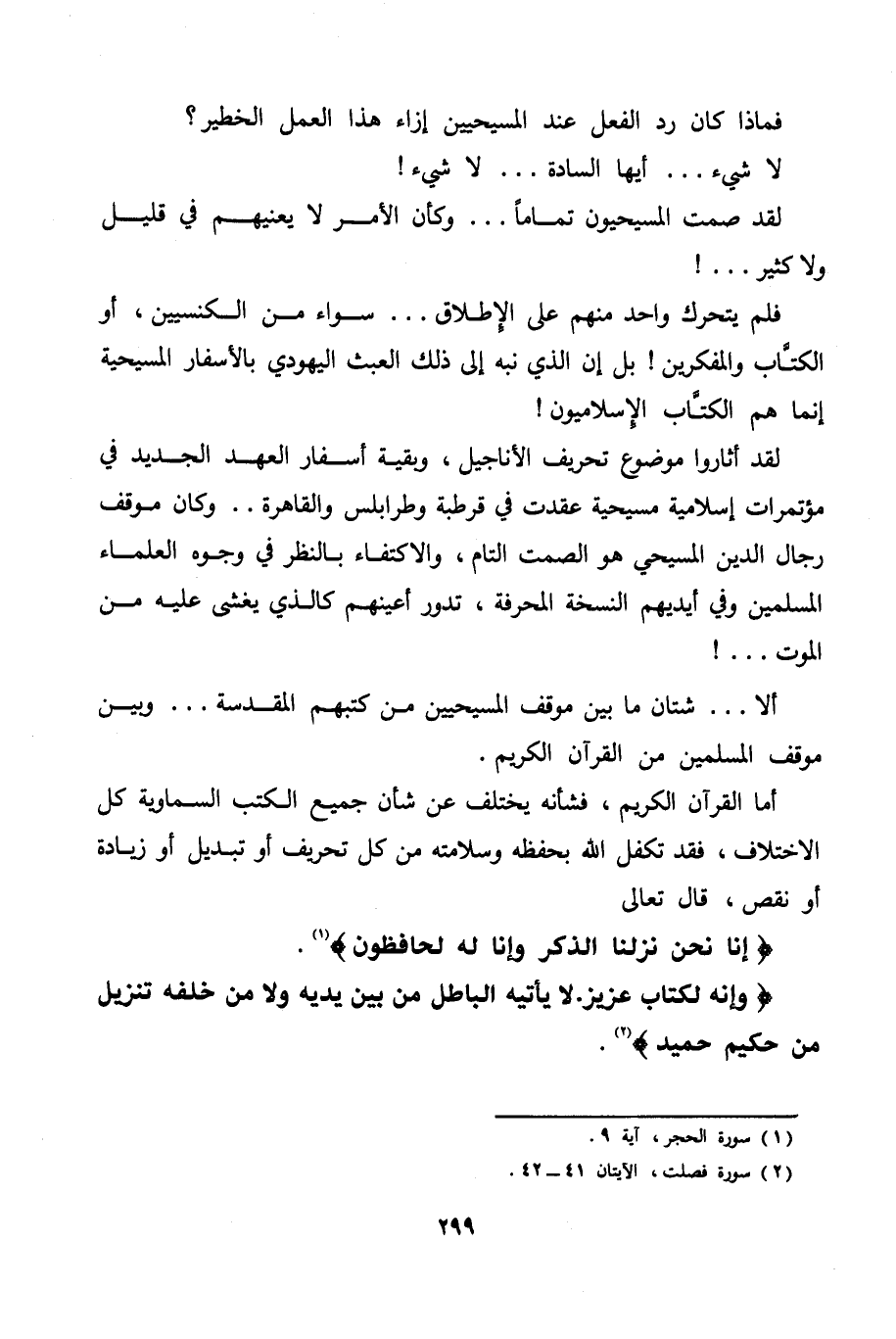 لقد أثاروا موضوع تحريف الأناجيل، وبقية أسفار العهد الجديد في مؤتمرات إسلامية مسيحية عقدت في قرطبة وطرابلس والقاهرة. . وكان موقف رجال الدين المسيحي هو الصمت التام، والاكتفاء بالنظر في وجوه العلماء المسلمين وفي أيديهم النسخة المحرفة، تدور أعينهم كالذي يغشى عليه من الموت. . .!