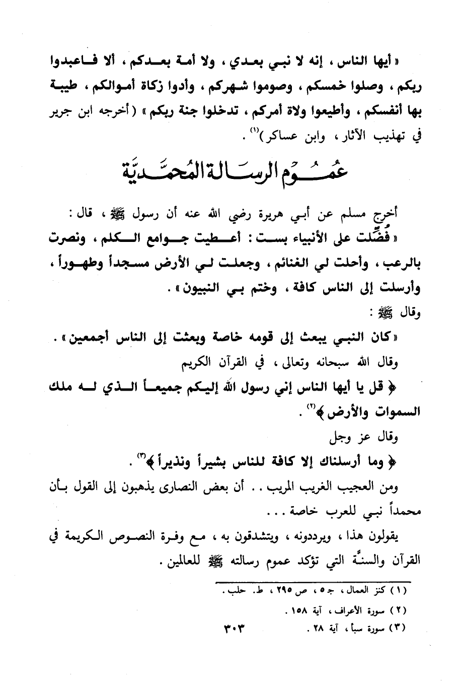 وقال الله سبحانه وتعالى، في القرآن الكريم {قُلْ يَا أَيُّهَا النَّاسُ إِنِّي رَسُولُ اللَّهِ إِلَيْكُمْ جَمِيعًا الَّذِي لَهُ مُلْكُ السَّمَاوَاتِ وَالْأَرْضِ} (¬2) .