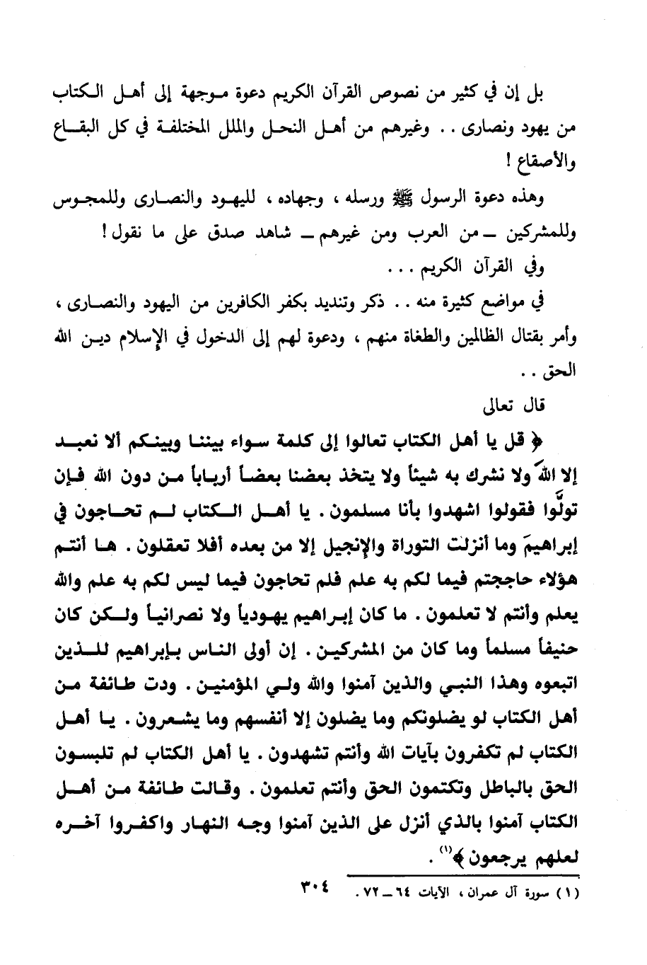 قال تعالى {قُلْ يَا أَهْلَ الْكِتَابِ تَعَالَوْا إِلَى كَلِمَةٍ سَوَاءٍ بَيْنَنَا وَبَيْنَكُمْ أَلَّا نَعْبُدَ إِلَّا اللَّهَ وَلَا نُشْرِكَ بِهِ شَيْئًا وَلَا يَتَّخِذَ بَعْضُنَا بَعْضًا أَرْبَابًا مِنْ دُونِ اللَّهِ فَإِنْ تَوَلَّوْا فَقُولُوا اشْهَدُوا بِأَنَّا مُسْلِمُونَ} {يَا أَهْلَ الْكِتَابِ لِمَ تُحَاجُّونَ فِي إِبْرَاهِيمَ وَمَا أُنْزِلَتِ التَّوْرَاةُ وَالْإِنْجِيلُ إِلَّا مِنْ بَعْدِهِ أَفَلَا تَعْقِلُونَ} {هَا أَنْتُمْ هَؤُلَاءِ حَاجَجْتُمْ فِيمَا لَكُمْ بِهِ عِلْمٌ فَلِمَ تُحَاجُّونَ فِيمَا لَيْسَ لَكُمْ بِهِ عِلْمٌ وَاللَّهُ يَعْلَمُ وَأَنْتُمْ لَا تَعْلَمُونَ} {مَا كَانَ إِبْرَاهِيمُ يَهُودِيًّا وَلَا نَصْرَانِيًّا وَلَكِنْ كَانَ حَنِيفًا مُسْلِمًا وَمَا كَانَ مِنَ الْمُشْرِكِينَ} {إِنَّ أَوْلَى النَّاسِ بِإِبْرَاهِيمَ لَلَّذِينَ اتَّبَعُوهُ وَهَذَا النَّبِيُّ وَالَّذِينَ آمَنُوا وَاللَّهُ وَلِيُّ الْمُؤْمِنِينَ} {وَدَّتْ طَائِفَةٌ مِنْ أَهْلِ الْكِتَابِ لَوْ يُضِلُّونَكُمْ وَمَا يُضِلُّونَ إِلَّا أَنْفُسَهُمْ وَمَا يَشْعُرُونَ} {يَا أَهْلَ الْكِتَابِ لِمَ