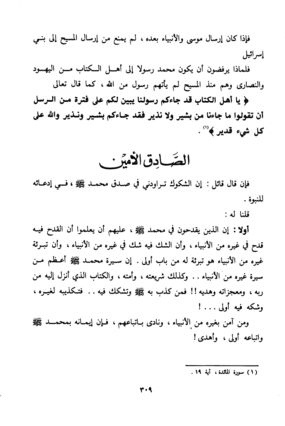 فلماذا يرفضون أن يكون محمد رسولًا إلى أهل الكتاب من اليهود والنصارى وهم منذ المسيح لم يأتهم رسول من الله، كما قال تعالى {يَا أَهْلَ الْكِتَابِ قَدْ جَاءَكُمْ رَسُولُنَا يُبَيِّنُ لَكُمْ عَلَى فَتْرَةٍ مِنَ الرُّسُلِ أَنْ تَقُولُوا مَا جَاءَنَا مِنْ بَشِيرٍ وَلَا نَذِيرٍ فَقَدْ جَاءَكُمْ بَشِيرٌ وَنَذِيرٌ وَاللَّهُ عَلَى كُلِّ شَيْءٍ قَدِيرٌ} (¬1) .
