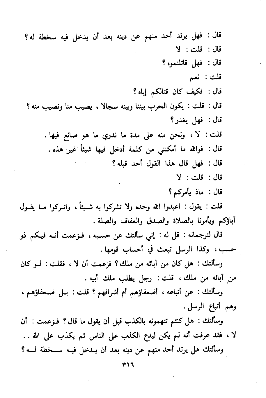 وسألتك: هل كنتم تتهمونه بالكذب قبل أن يقول ما قال؟ فزعمت: أن لا، فقد عرفت أنه لم يكن ليدع الكذب على الناس ثم يكذب على الله. .