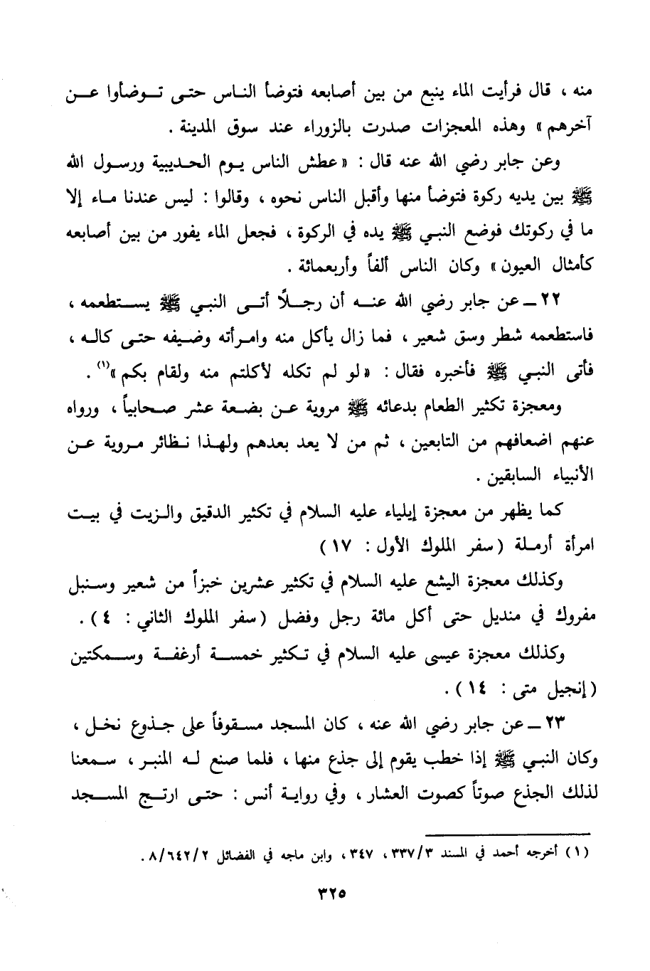 منه، قال فرأيت الماء ينبع من بين أصابعه فتوضأ الناس حتى توضأوا عن آخرهم» وهذه المعجزات صدرت بالزوراء عند سوق المدينة.