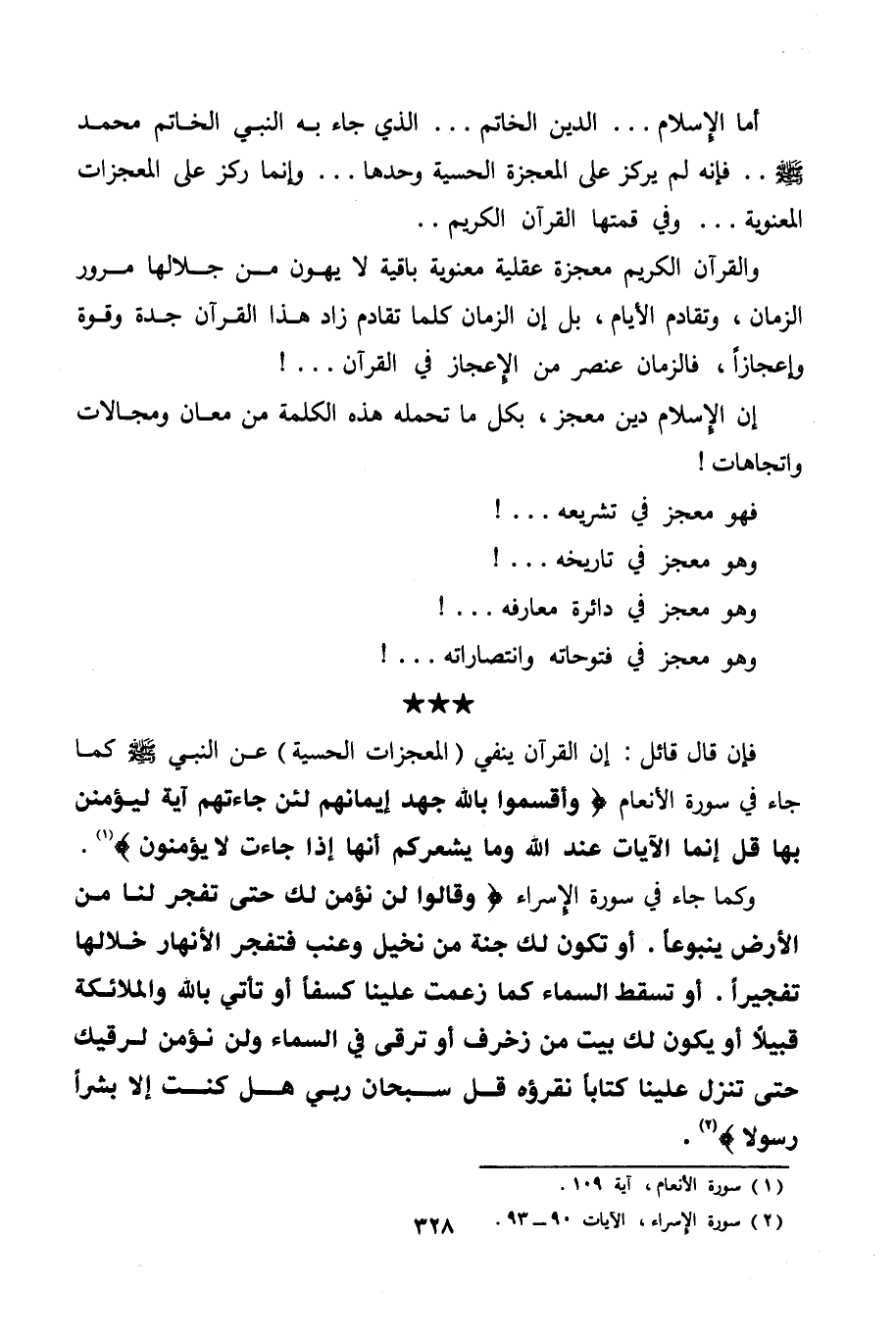أما الإسلام. . . الدين الخاتم. . . الذي جاء به النبي الخاتم محمد صلى الله عليه وسلم. . فإنه لم يركز على المعجزة الحسية وحدها. . . وإنما ركز على المعجزات المعنوية. . . وفي قمتها القرآن الكريم. .