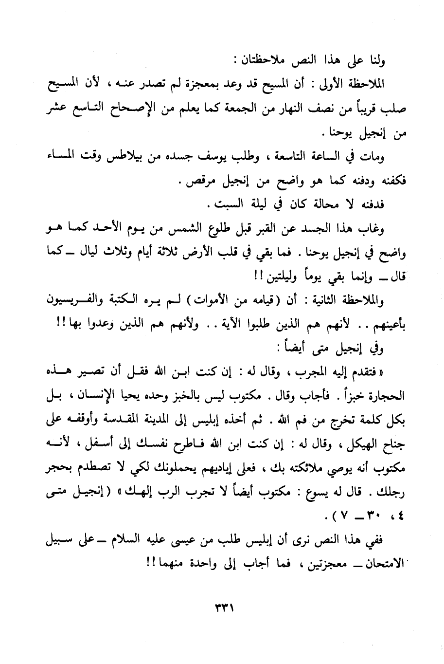 ففي هذا النص نرى أن إبليس طلب من عيسى عليه السلام -على سبيل الامتحان- معجزتين، فما أجاب إلى واحدة منهما!!