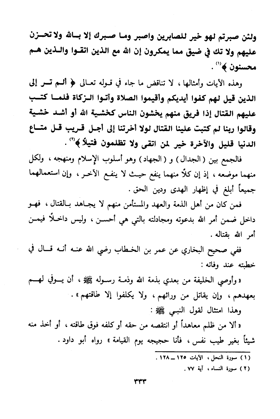 وهذه الآيات وأمثالها، لا تناقض ما جاء في قوله تعالى {أَلَمْ تَرَ إِلَى الَّذِينَ قِيلَ لَهُمْ كُفُّوا أَيْدِيَكُمْ وَأَقِيمُوا الصَّلَاةَ وَآتُوا الزَّكَاةَ فَلَمَّا كُتِبَ عَلَيْهِمُ الْقِتَالُ إِذَا فَرِيقٌ مِنْهُمْ يَخْشَوْنَ النَّاسَ كَخَشْيَةِ اللَّهِ أَوْ أَشَدَّ خَشْيَةً وَقَالُوا رَبَّنَا لِمَ كَتَبْتَ عَلَيْنَا الْقِتَالَ لَوْلَا أَخَّرْتَنَا إِلَى أَجَلٍ قَرِيبٍ قُلْ مَتَاعُ الدُّنْيَا قَلِيلٌ وَالْآخِرَةُ خَيْرٌ لِمَنِ اتَّقَى وَلَا تُظْلَمُونَ فَتِيلًا} (¬2) .