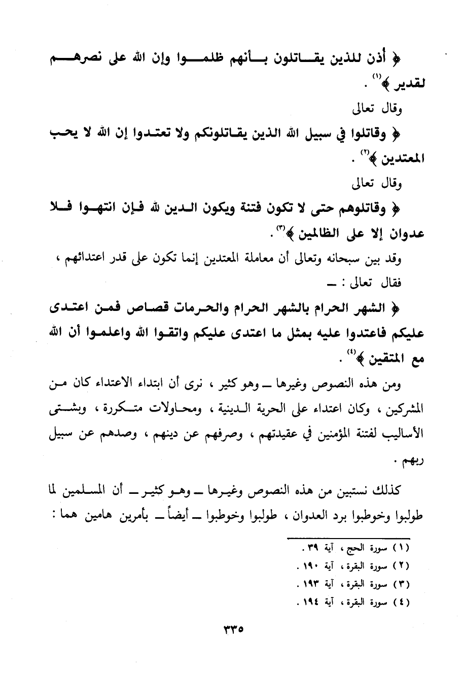 وقال تَعالى {وَقَاتِلُوا فِي سَبِيلِ اللَّهِ الَّذِينَ يُقَاتِلُونَكُمْ وَلَا تَعْتَدُوا إِنَّ اللَّهَ لَا يُحِبُّ الْمُعْتَدِينَ} (¬2) .