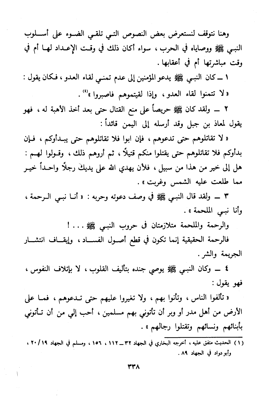 وهنا نتوقف لنستعرض بعض النصوص التي تلقي الضوء على أسلوب النبي صلى الله عليه وسلم ووصاياه في الحرب، سواء أكان ذلك في وقت الإعداد لها أم في وقت مباشرتها أم في أعقابها.