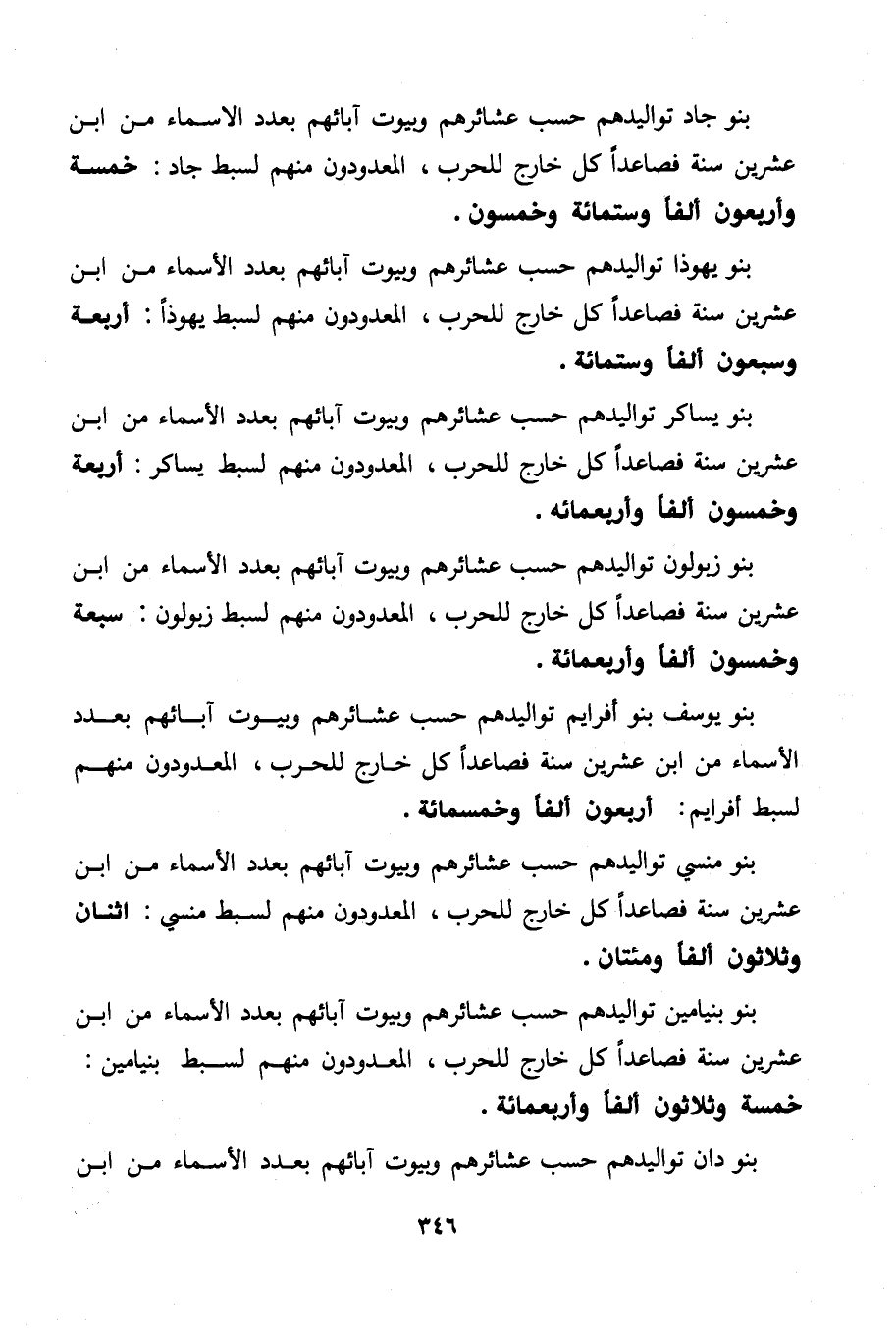 بنو يهوذا تواليدهم حسب عشائرهم وبيوت آبائهم بعدد الأسماء من ابن عشرين سنة فصاعدًا كل خارج للحرب، المعدودون منهم لسبط يهوذًا: أربعة وسبعون ألفًا وستمائة.