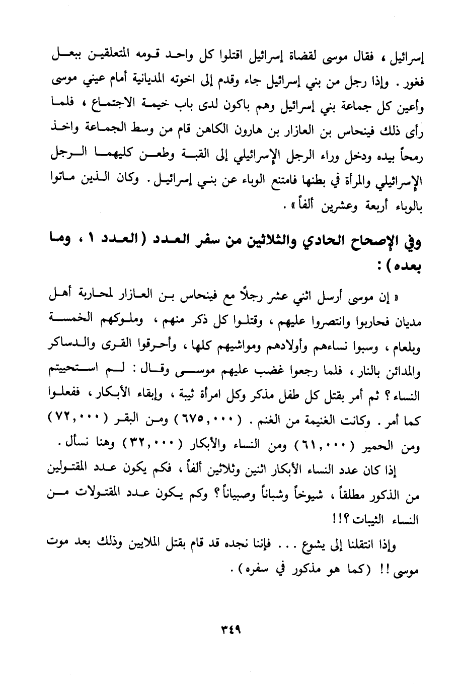 " إن موسى أرسل اثني عشر رجلًا مع فينحاس بن العازار لمحاربة أهل مديان فحاربوا وانتصروا عليهم، وقتلوا كل ذكر منهم، وملوكهم الخمسة وبلعام، وسبوا نساءهم وأولادهم ومواشيهم كلها، وأحرقوا القرى والدساكر والمدائن بالنار، فلما رجعوا غضب عليهم موسى وقال: لم استحييتم النساء؟ ثم أمر بقتل كل طفل مذكر وكل امرأة ثيبة، وإبقاء الأبكار، ففعلوا كما أمر. وكانت الغنيمة من الغنم. (675. 000) ومن البقر (72. 000) ومن الحمير (61. 000) ومن النساء والأبكار (32. 000) وهنا نسأل.