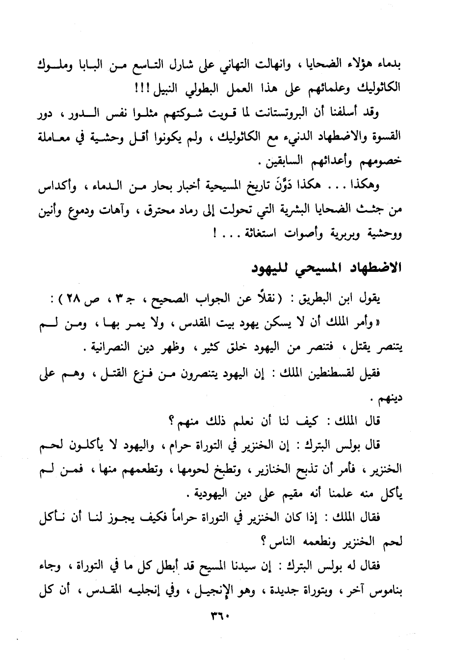 قال الملك: كيف لنا أن نعلم ذلك منهم؟ قال بولس البترك: إن الخنزير في التوراة حرام، واليهود لا يأكلون لحم الخنزير، فأمر أن تذبح الخنازير، وتطبخ لحومها، وتطعمهم منها، فمن لم يأكل منه علمنا أنه مقيم على دين اليهودية.