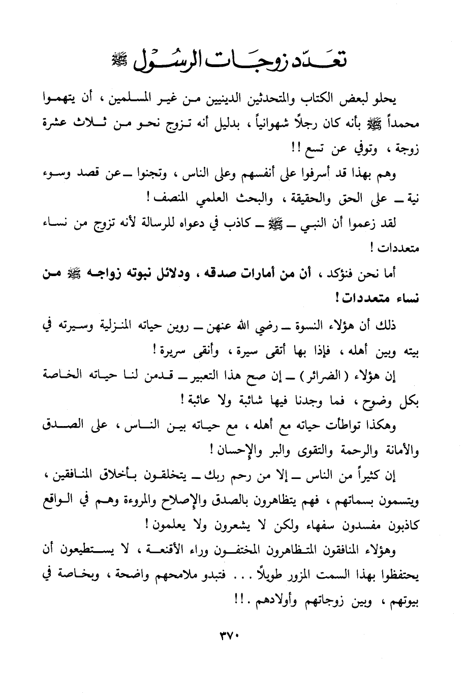 يحلو لبعض الكتاب والمتحدثين الدينيين من غير المسلمين، أن يتهموا محمدًا صلى الله عليه وسلم بأنه كان رجلًا شهوانيًا، بدليل أنه تزوج نحو من ثلاث عشرة زوجة، وتوفي عن تسع!!