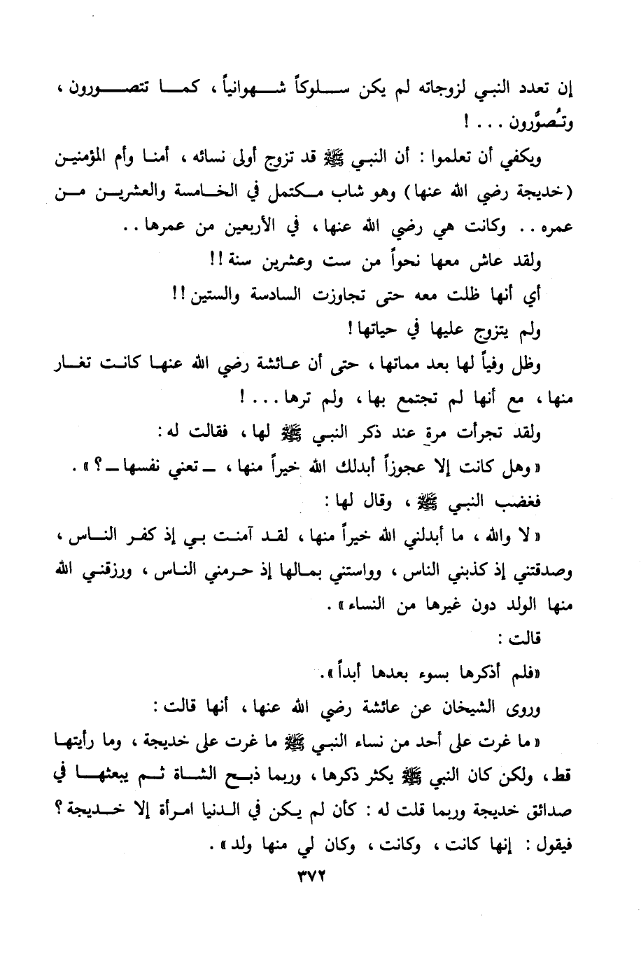 «لا والله، ما أبدلني الله خيرًا منها، لقد آمنت بي إذ كفر الناس، وصدقتني إذ كذبني الناس، وواستني بمالها إذ حرمني الناس، ورزقني الله منها الولد دون غيرها من النساء» .