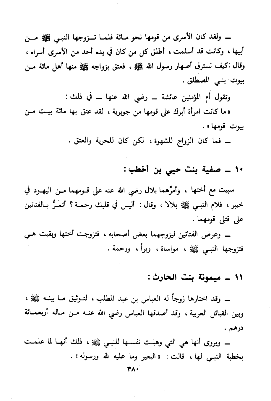 - ولقد كان الأسرى من قومها نحو مائة فلما تزوجها النبي صلى الله عليه وسلم من أبيها، وكانت قد أسلمت، أطلق كل من كان في يده أحد من الأسرى أسراه، وقال: كيف نسترق أصهار رسول الله صلى الله عليه وسلم، فعتق بزواجه صلى الله عليه وسلم منها أهل مائة من بيوت بني المصطلق.
