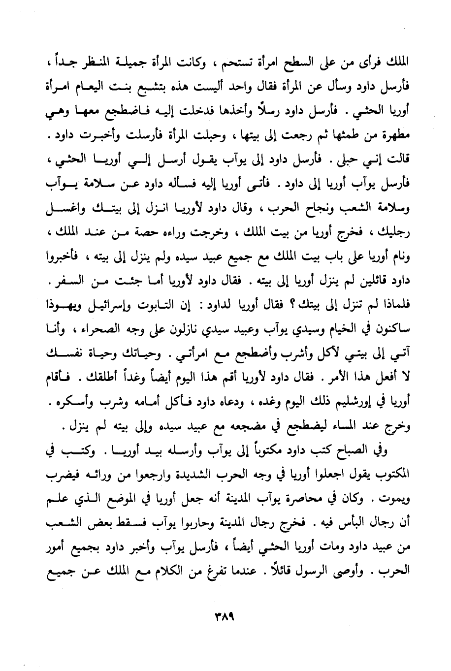 الملك فرأى من على السطح امرأة تستحم، وكانت المرأة جميلة المنظر جدًّا، فأرسل داود وسأل عن المرأة فقال واحد أليست هذه بتشبع بنت اليعام امرأة أوريا الحثي؟ فأرسل داود رسلًا وأخذها فدخلت إليه فاضطجع معها وهي مطهرة من طمثها ثم رجعت إلى بيتها، وحبلت المرأة فأرسلت وأخبرت داود. قالت إني حبلى. فأرسل داود إلى يوآب يقول أرسل إلي أوريا الحثي، فأرسل يوآب أوريا إلى داود. فأتى أوريا إليه فسأله داود عن سلامة يوآب وسلامة الشعب ونجاح الحرب، وقال داود لأوريا انزل إلى بيتك واغسل رجليك، فخرج أوريا من بيت الملك، وخرجت وراءه حصة من عند الملك، ونام أوريا على باب بيت الملك مع جميع عبيد سيده ولم ينزل إلى بيته، فأخبروا داود قائلين لم ينزل أوريا إلى بيته. فقال داود لأوريا أما جئت من السفر. فلماذا لم تنزل إلى بيتك؟ فقال أوريا لداود: إن التابوت وإسرائيل ويهوذا ساكنون في الخيام وسيدي يوآب وعبيد سيدي