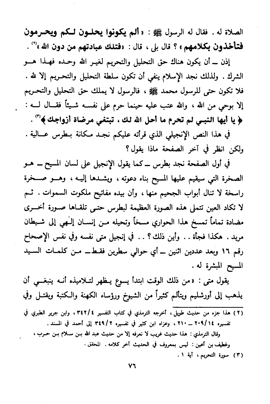 الصلاة له. فقال له الرسول - صَلَّى اللَّهُ عَلَيْهِ وَسَلِّم -: " ألم يكونوا يحلون لكم ويحرمون فتأخذون بكلامهم "؟ قال بلى، قال: " فتلك عبادتهم من دون الله» (¬1) . إذن- أن يكون هناك حق التحليل والتحريم لغير الله وحده فهذا هو الشرك. ولذلك نجد الإسلام ينفي أن تكون سلطة التحليل والتحريم إلا لله.