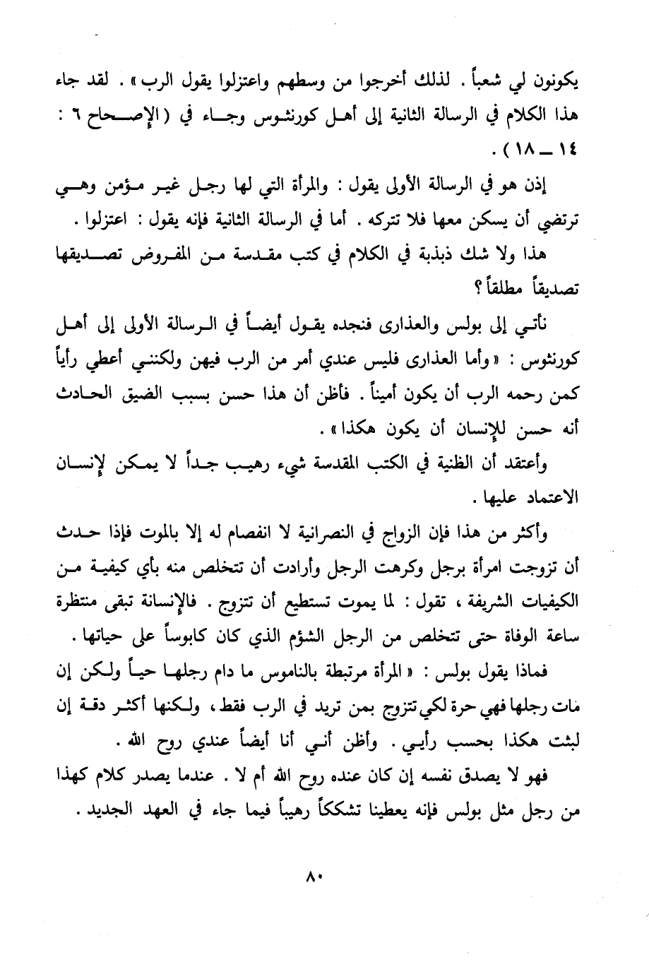 إذن هو في الرسالة الأولى يقول: والمرأة التي لها رجل غير مؤمن وهي ترتضي أن يسكن معها فلا تتركه. أما في الرسالة الثانية فإنه يقول: اعتزلوا.
